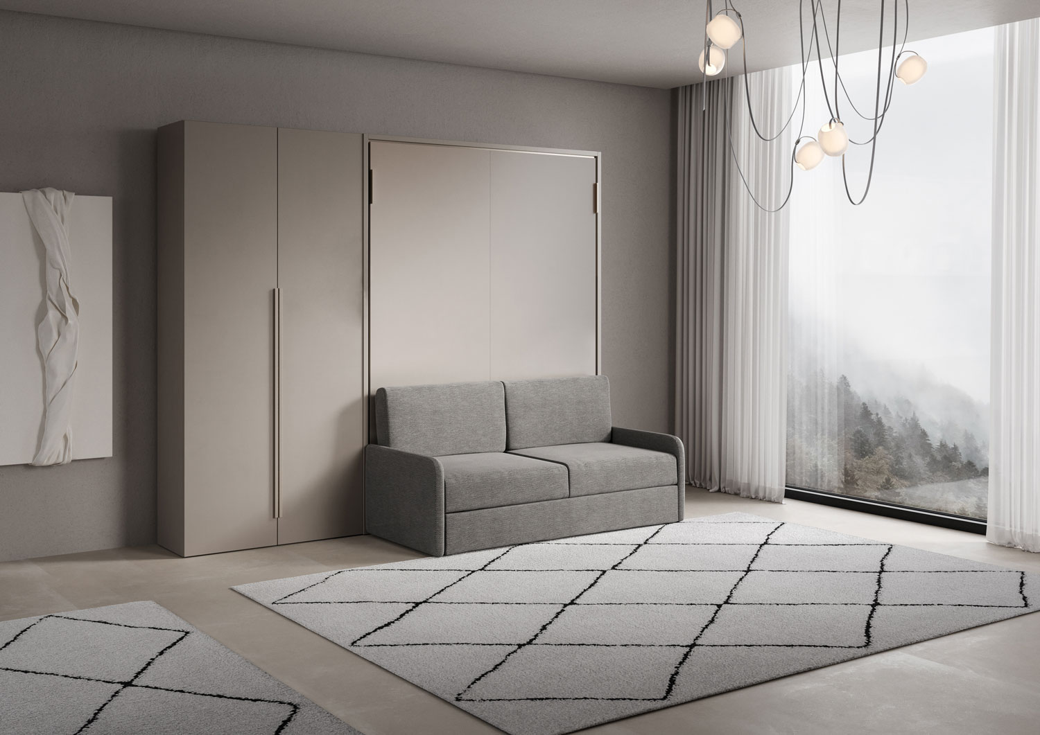 160cm vertical foldaway double bed Versia Sofà with sofa and 2-door wardrobe on the left Clay