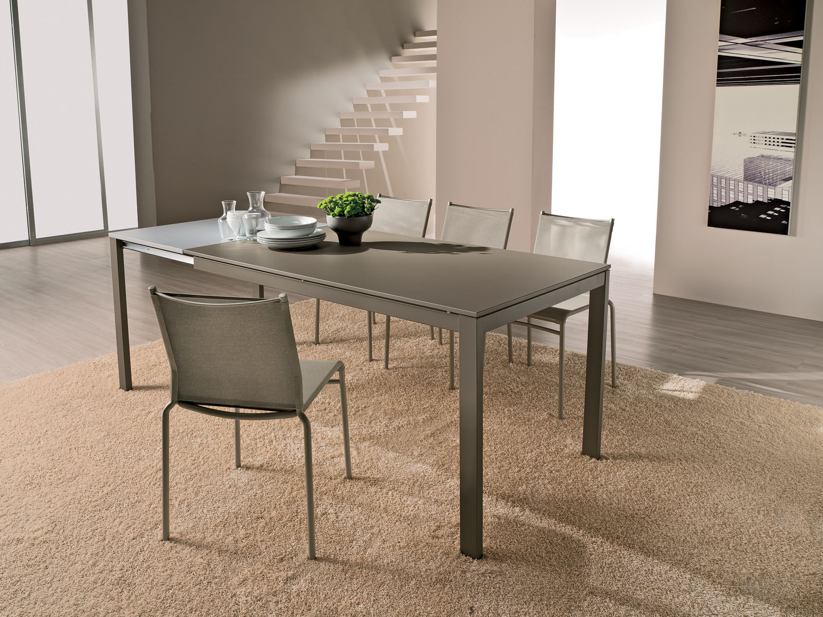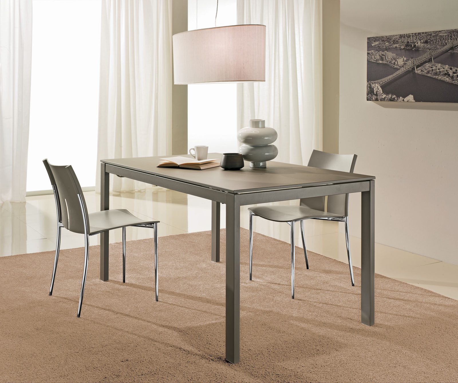Extendable table with lacquered or chromed steel frame and top in melamine, textured melamine, scratch-resistant Unicolor, crystal, scratch-resistant crystal and SuperCeramic.