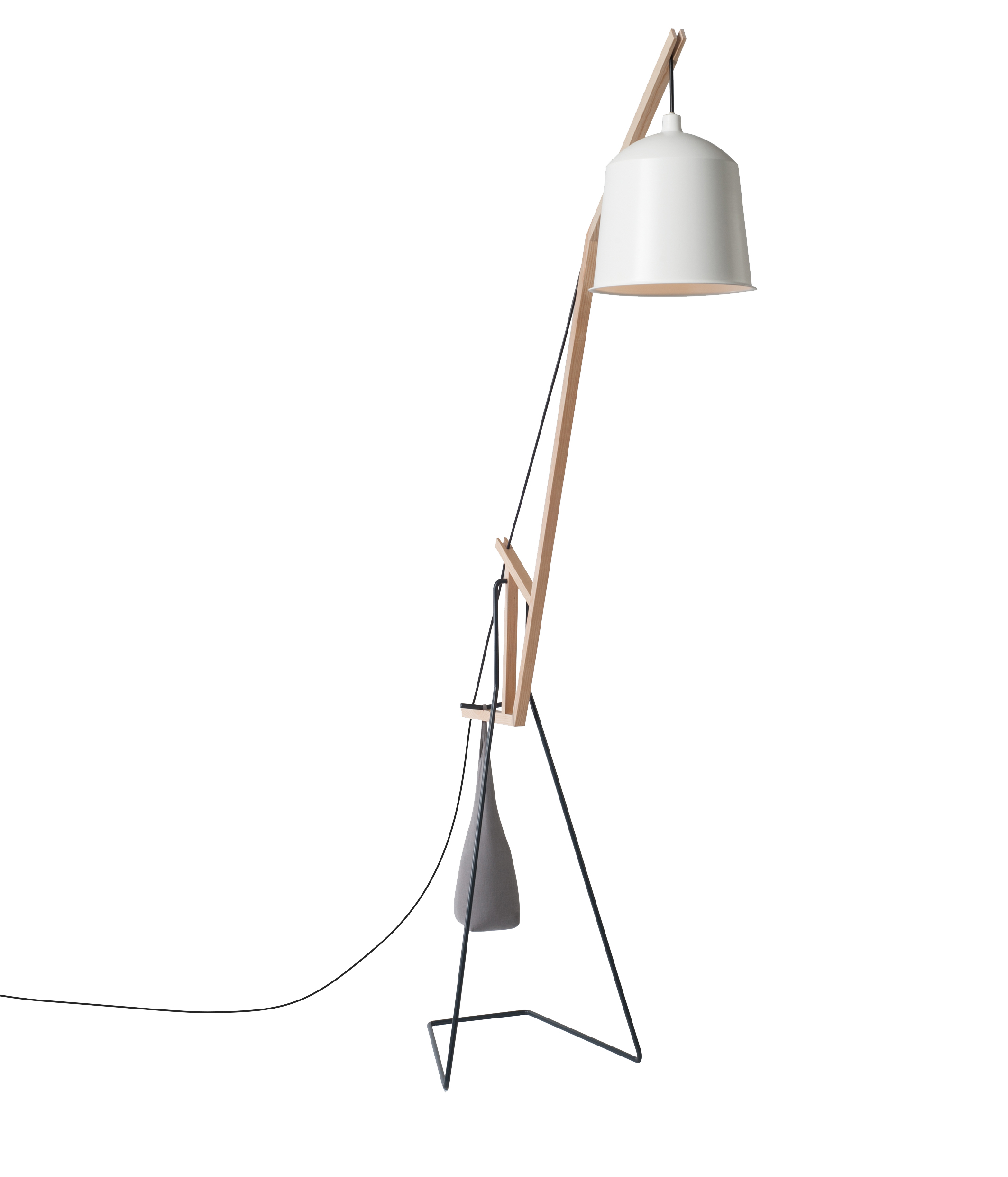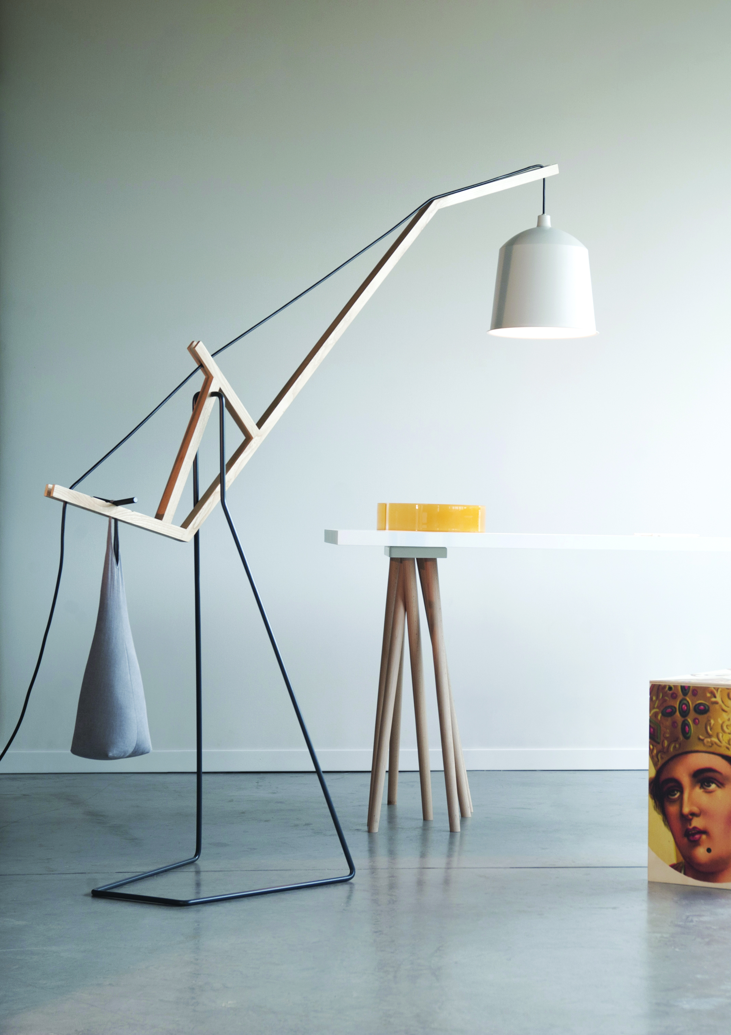A long crane that crosses the room and balances a lampshade on one side, against a sandbag on the other.