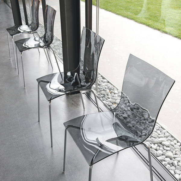 Stackable chair, shell in polymer printed; structure in lacquered or chromed metal.