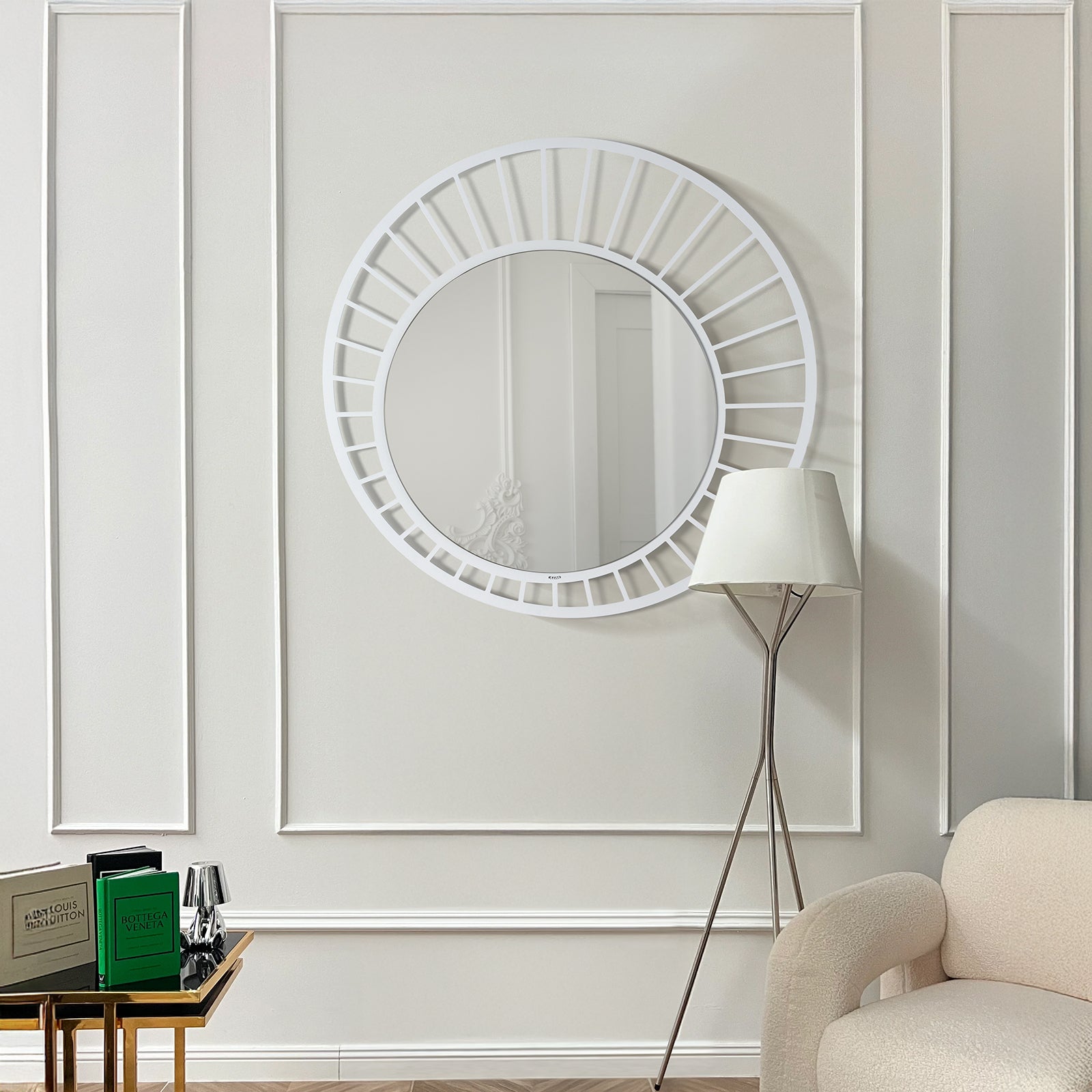 With a diameter of 90 cm, Ray is a stunning addition to any wall: in the entryway, living room, above a console table, or in the bedroom. Its striking presence is undeniable, yet it maintains a simple and refined elegance. Available in four versatile and trendy colors—black, mud, marble white, and beige—this mirror can adapt to a variety of decor palettes, from light and natural to bold and modern.