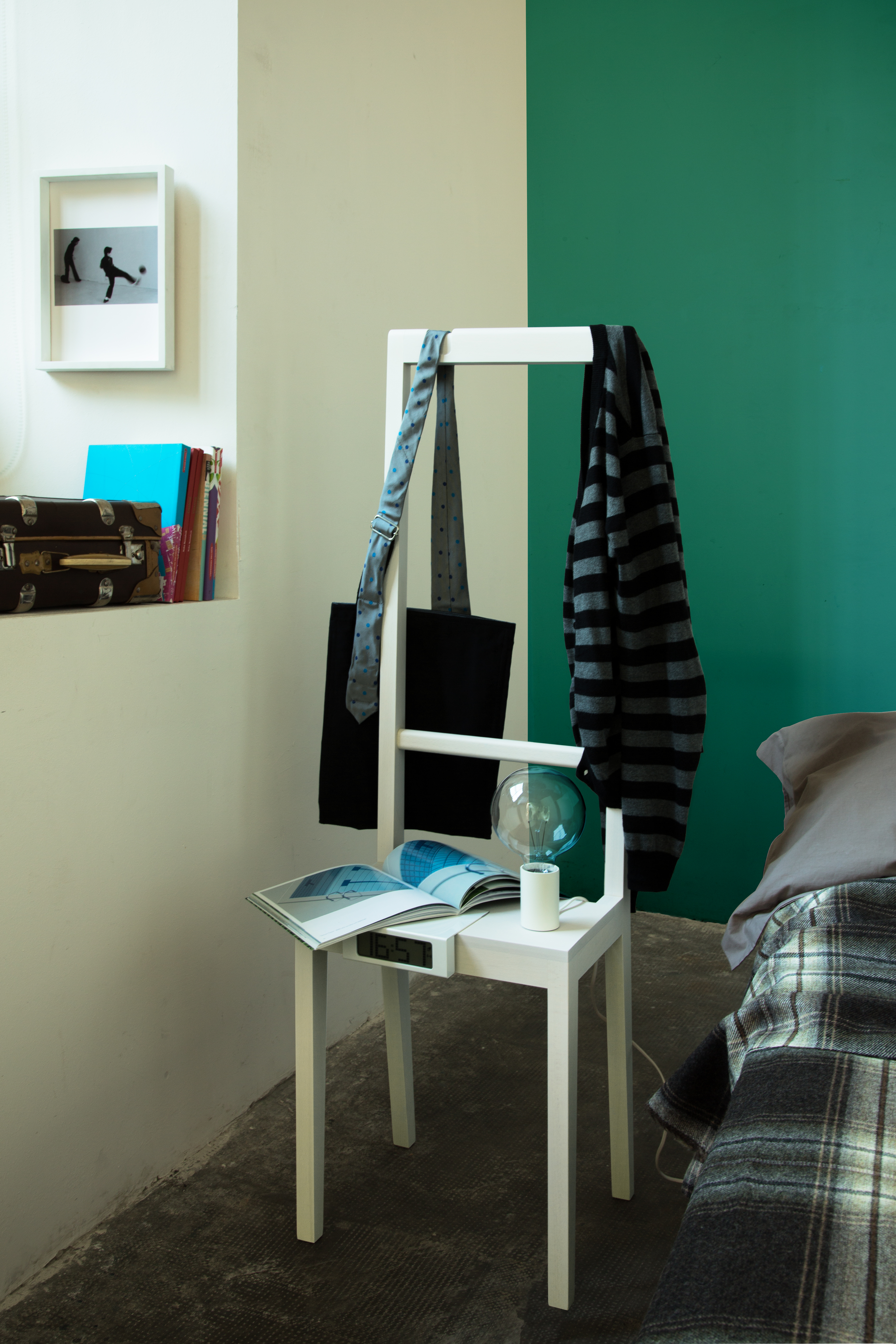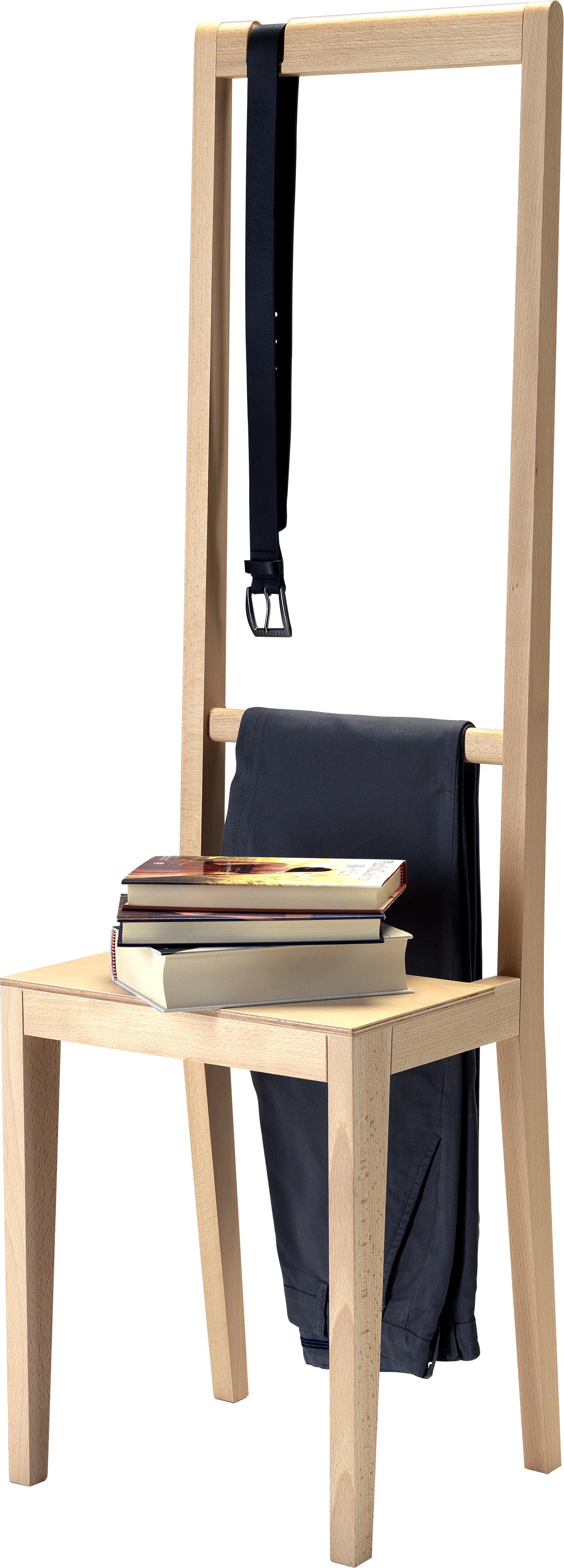 Thanks to a few small adjustments it becomes a perfect coat hanger: the upper recess holds the belt, tie or scarf; the crosspiece is for hanging clothes; the support surface is also useful for stacking books and magazines.