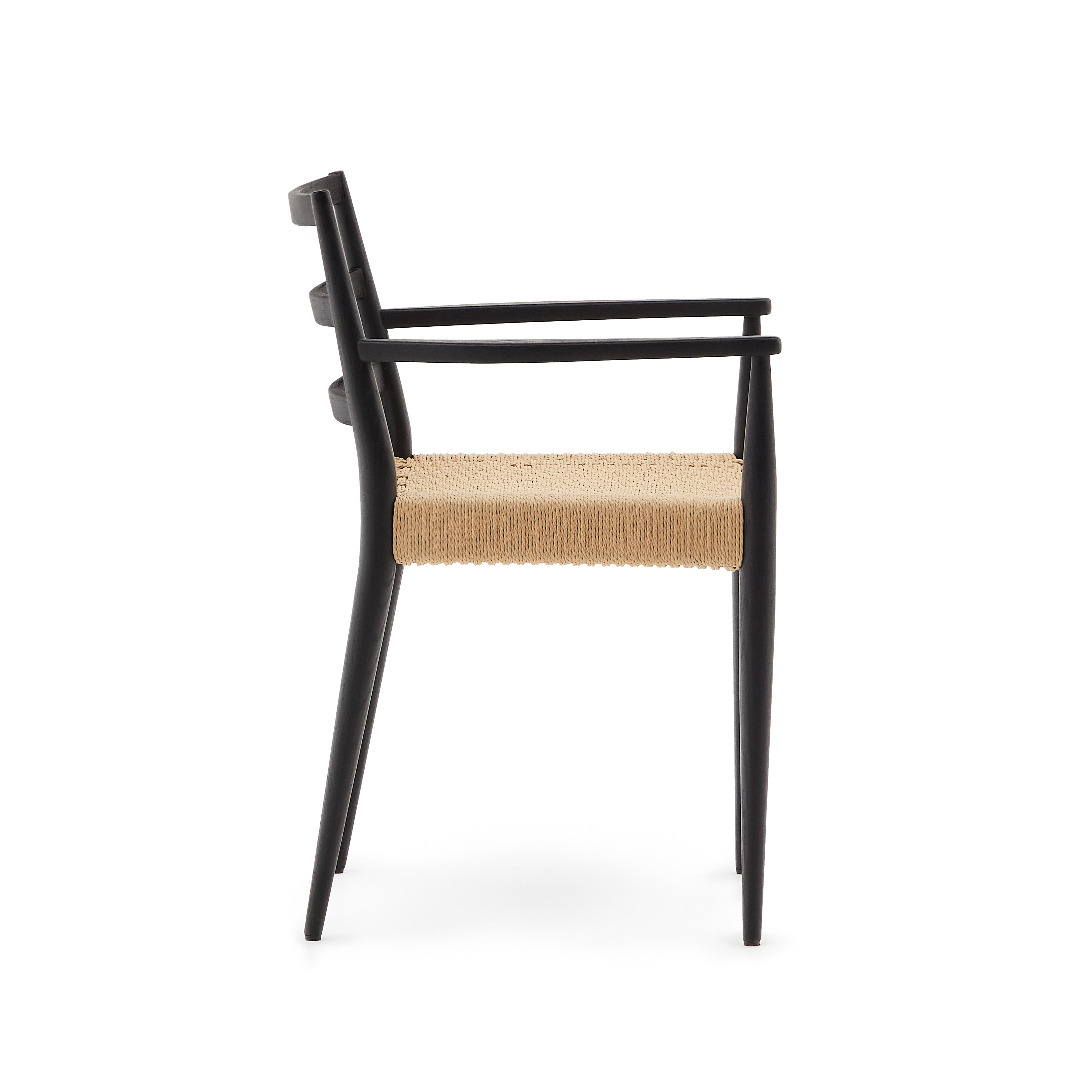 Analy chair with armrests in solid oak wood with black finish and rope seat
