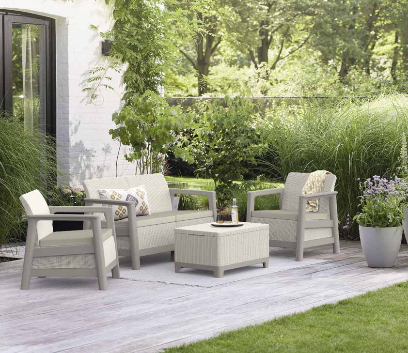 Easy to assemble. Made of weather-resistant resin. Jute-effect texture. Two-tone design. High-capacity storage table.