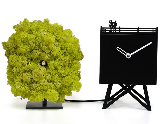The ironic and green design of Bird Watching leads us to observe cuckoos in the woods. It is a table cuckoo that furnishes desks, shelves and furniture, at home or in the office. The sighting house is made of wood on which there are two birdwatcher silhouettes ready to photograph. The tree, among whose branches the bird is hidden, is entirely covered with MOSS by Verde Profilo, a natural lichen that can be used indoors without natural lighting without undergoing variations. A light sensitive sensor automatically stops the ringer in the absence of light.