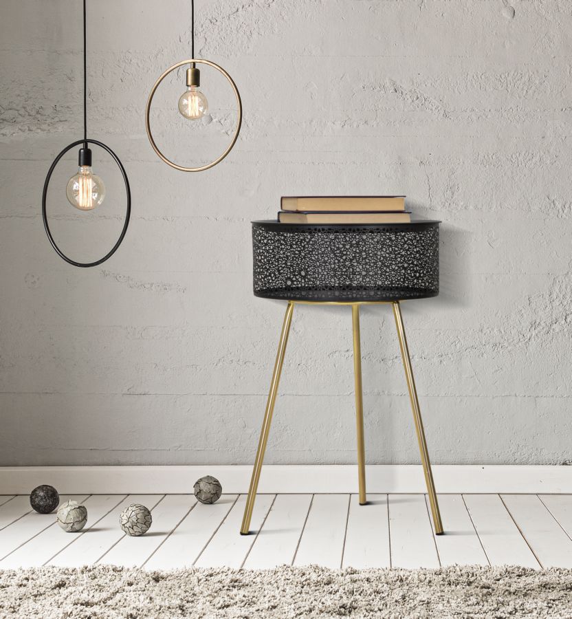 Round coffee table in black metal with golden legs. The top is finely carved to give a touch of elegance. The top is removable, inside there is a practical container.