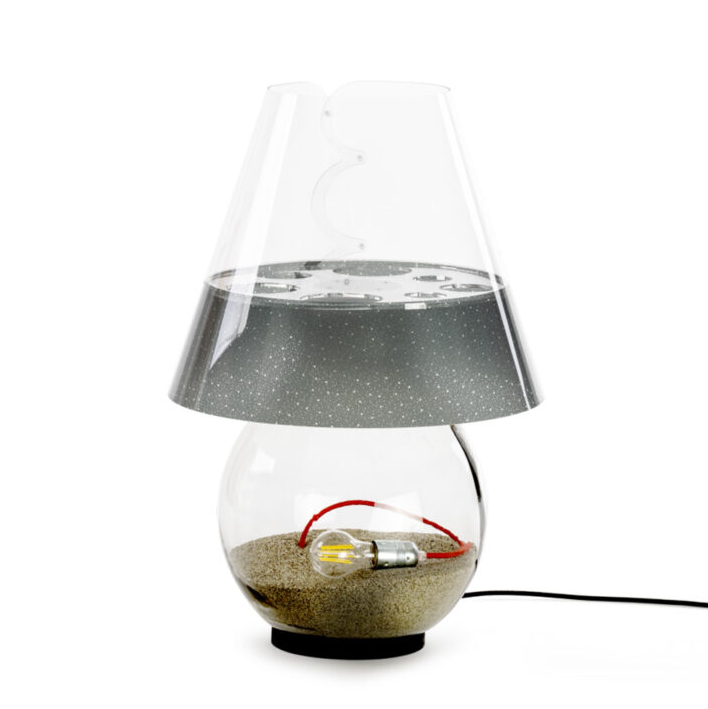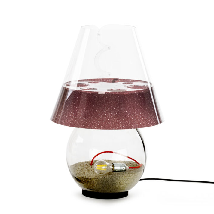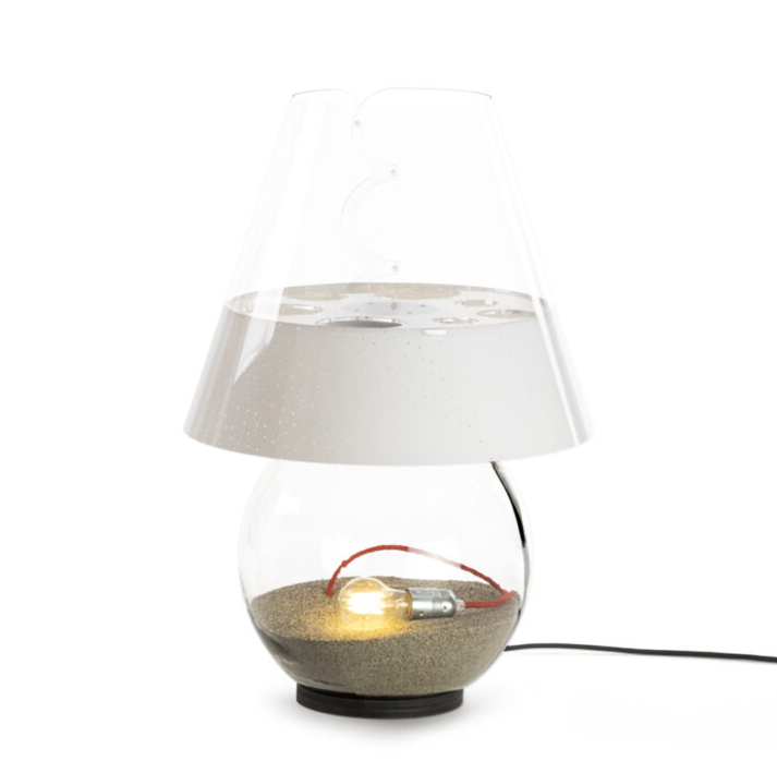 The light, positioned inside the body of the lamp, creates a suggestive effect that recalls the sun gently dipping into the water.