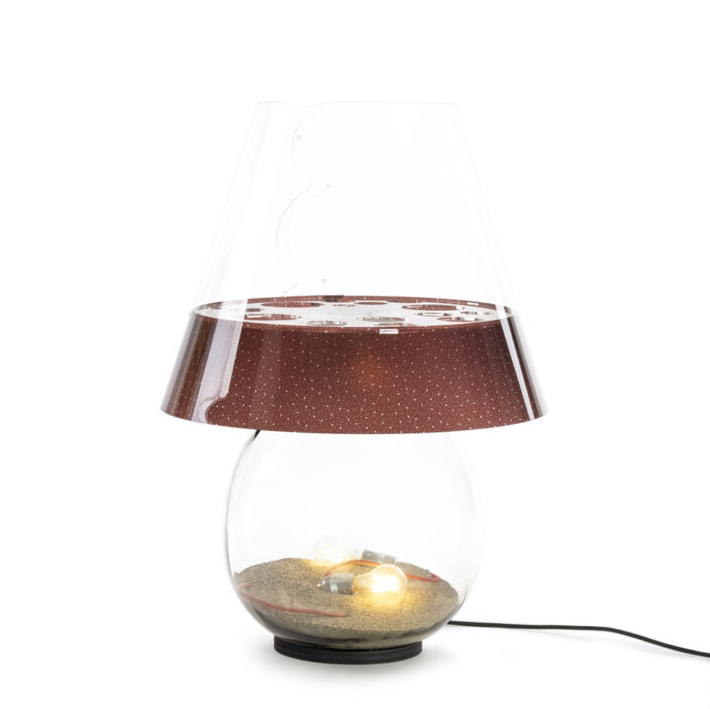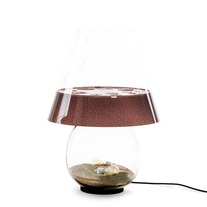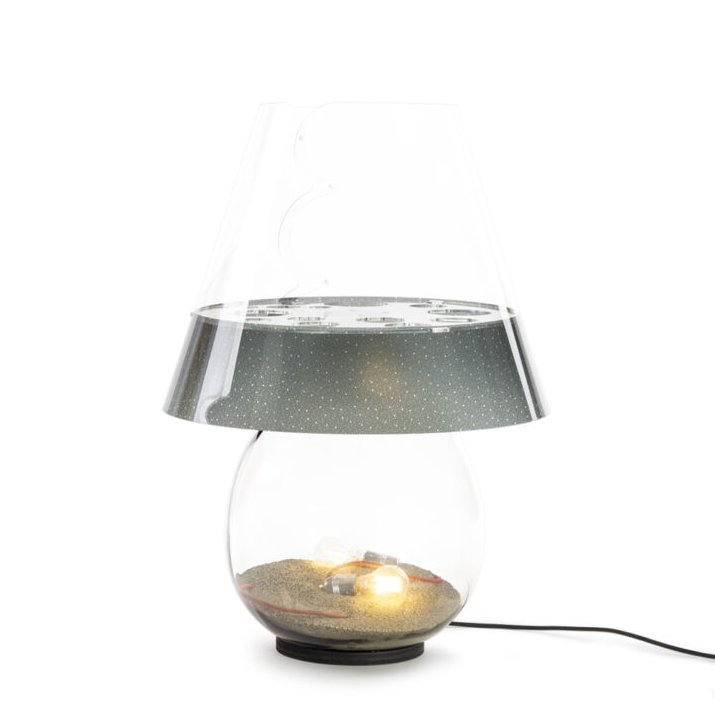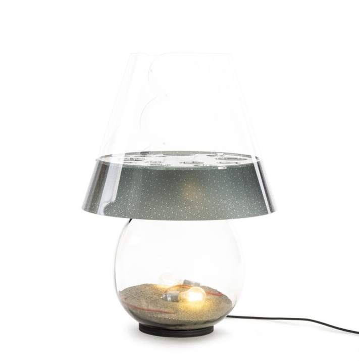 BONBONNE is a Made in Italy design product, with a transparent printed polycarbonate lampshade, glass body and acrylic crystal details.