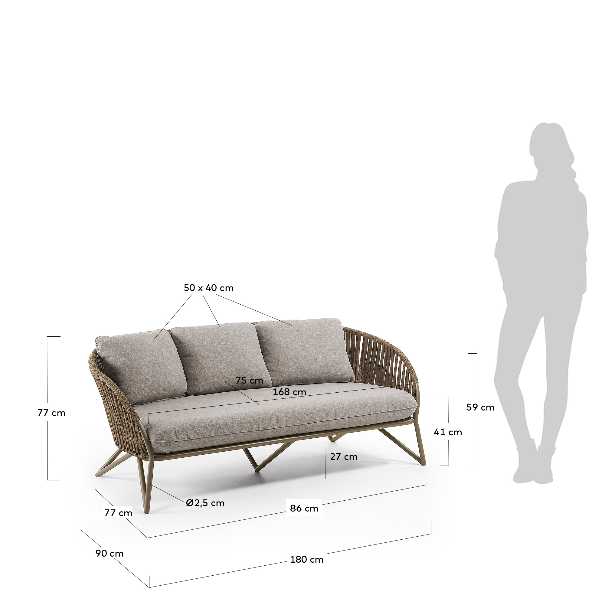 | Maintenance | Clean the legs and rope with a cloth dampened in a mild soapy solution and dry immediately with a dry cloth or vacuum cleaner. Cold wash for fabric cushions. |