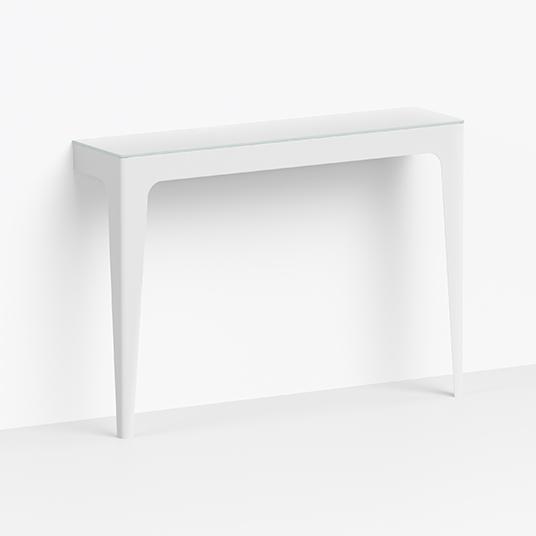 The Bridge console has a design with a sandblasted painted steel structure and a 8 mm back-painted acid-etched tempered glass top.