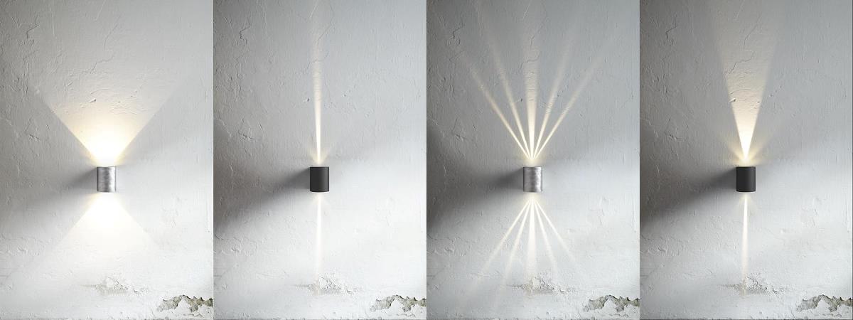 Outdoor spotlight in metal and glass, with 3 diffusers for 3 different types of light.
