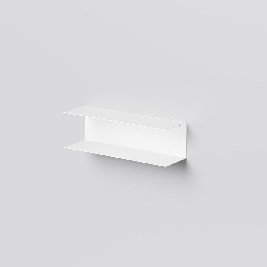 Compact wall-mounted Cargo shelf, made of sand-blasted painted steel sheet.