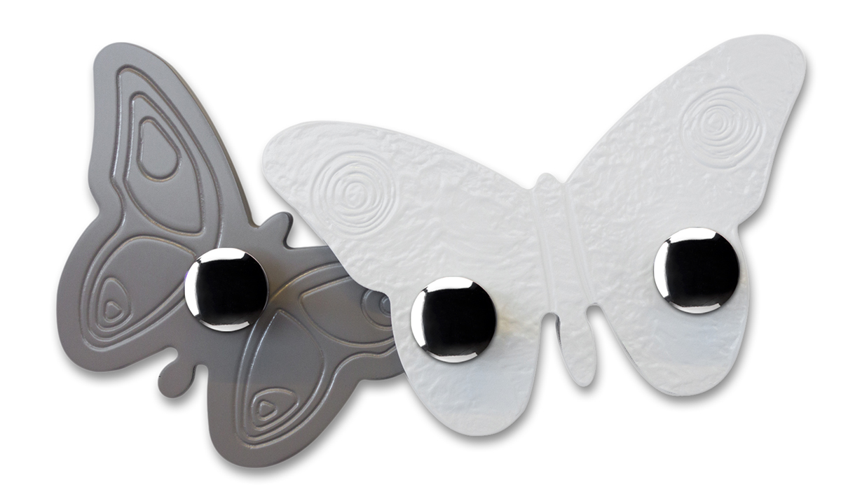 Coat hanger with overlapping shaped structures. An engraved element with dove gray lacquered finish and an ivory white lacquered element on relief material processing. Three chrome knobs.