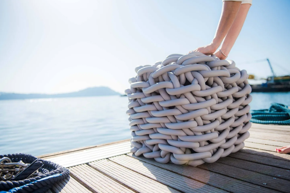 Crochet poufs made of woven rubber thread, combine refined design, comfort and sustainability in unique handcrafted pieces.