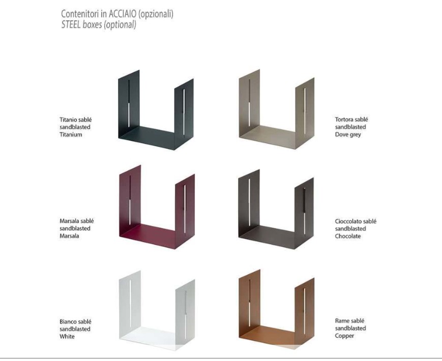 The structures can be completed with optional containers, made of 1.5 mm thick steel sheet painted with a sandblasted finish or 12 mm thick eco-friendly laminate.
