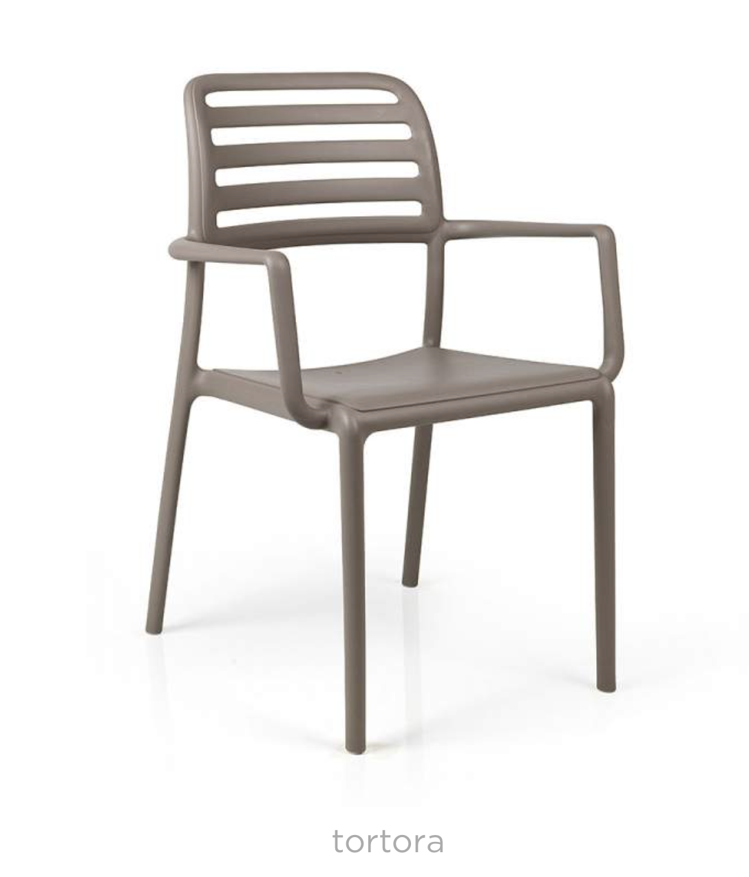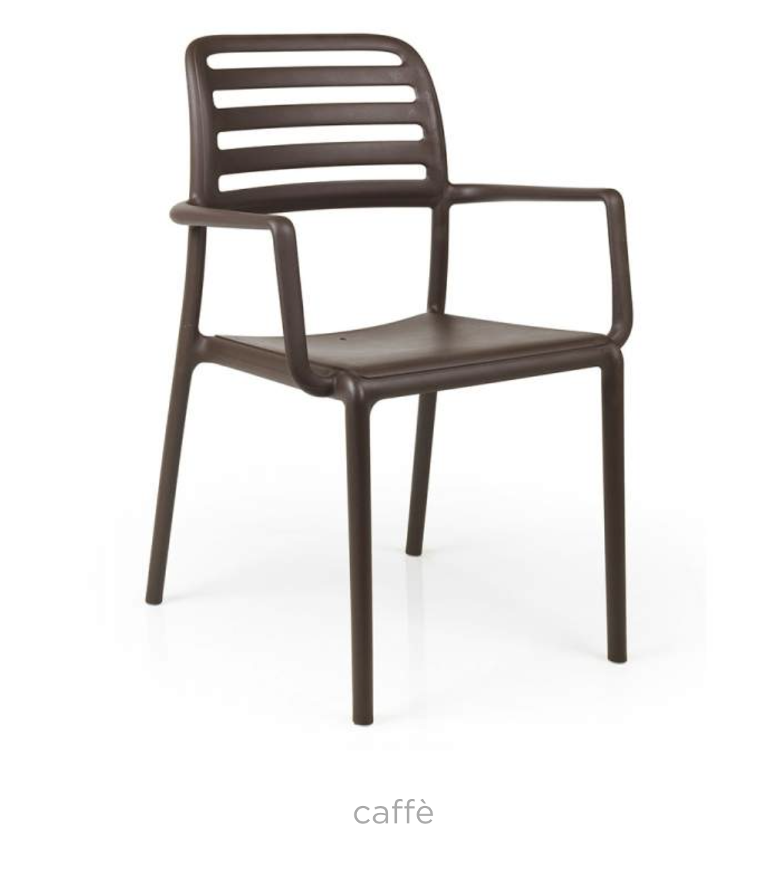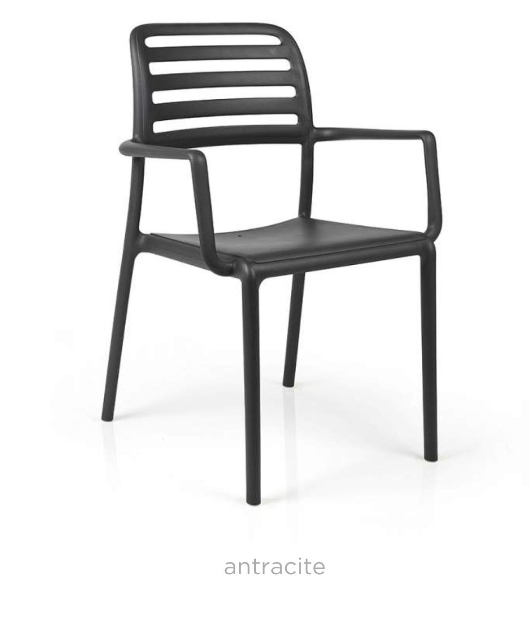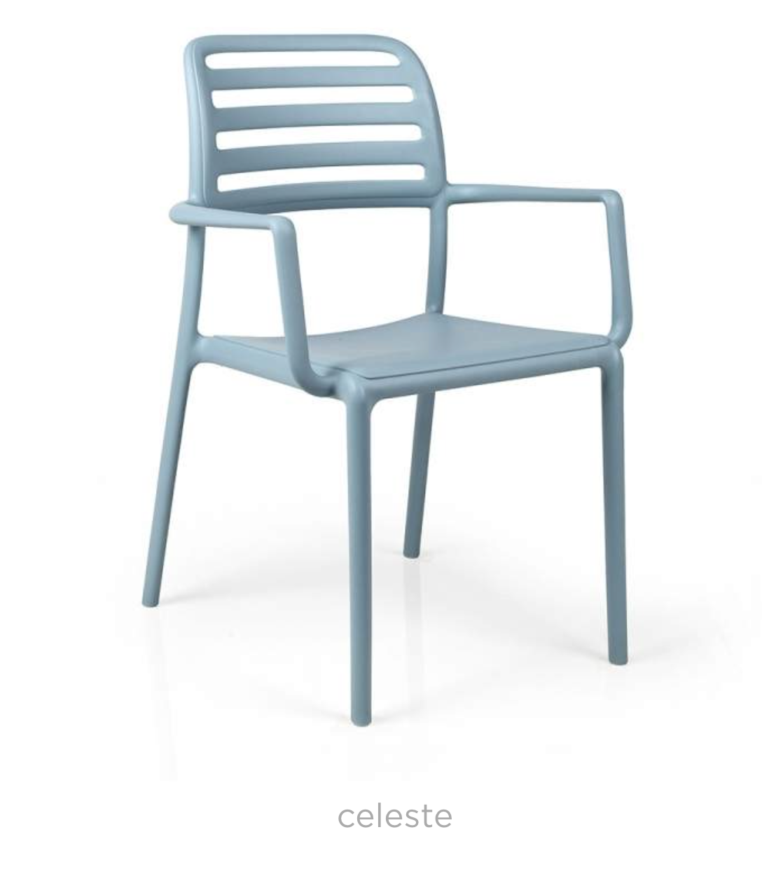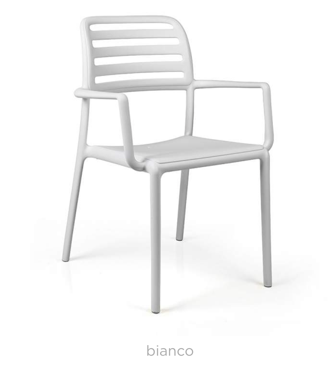 Essential lines for a light, practical and comfortable seat. Costa is an outdoor chair with armrests and slatted backrest in fiberglass resin: a single resin tube, without interruptions, with rounded profiles and corners.