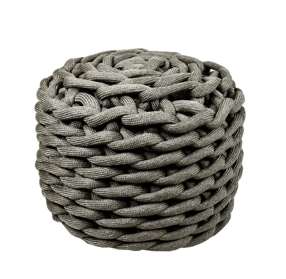Pouf made with 25 mm hand-knotted polypropylene rope, combines craftsmanship and resistance.