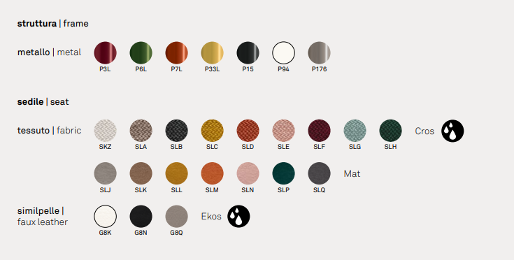 Cozy is simplicity, versatility and lightness. Enveloping seat and backrest padded and covered in fabric, supported by a colored metal frame. Choose your favorite color combination thanks to the vast choice of fabrics and the seven colors of the metal barrel.