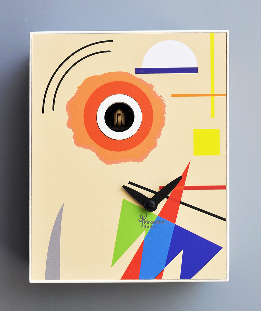 The D'Après Kandinsky cuckoo clock, with its compact and artistic design, measures 16.5 x 20 x 10 cm (W 6.5 x H 7.8 x D 3.9 in), ideal for decorating living rooms, kitchens, or bedrooms with a creative and modern touch. Crafted from high-quality materials and featuring a precise quartz movement, it combines functionality, style, and artistic charm inspired by the famous painter. Perfect as a decorative furnishing accessory for modern and contemporary interiors.