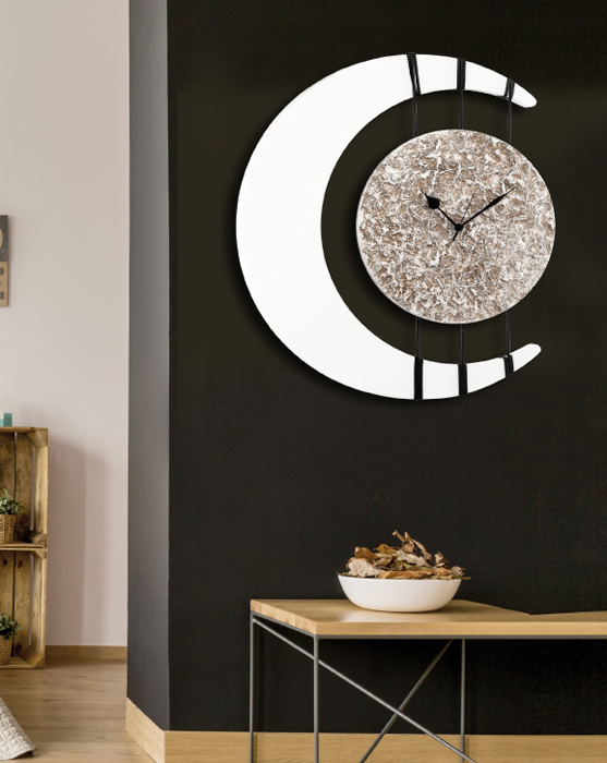 Shaped clock, ivory lacquered, hand-decorated with silver leaf on material, element suspended on ropes.