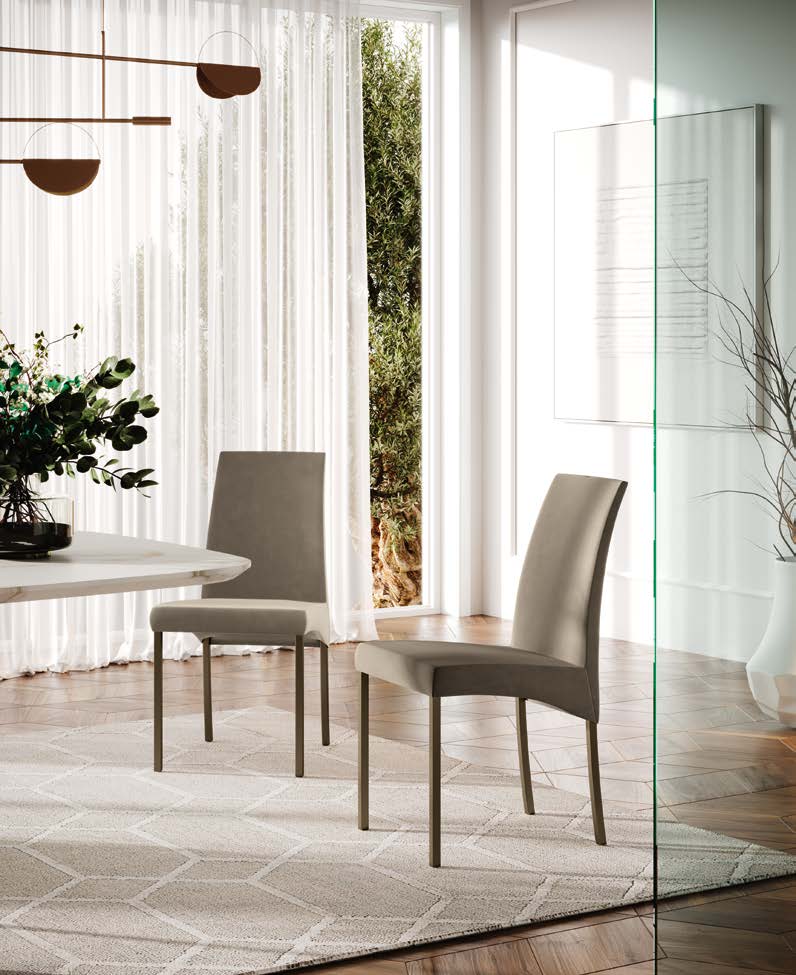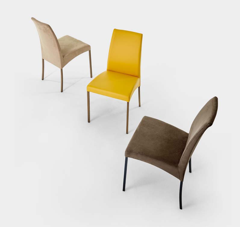 Chair with lacquered steel frame, padded seat and backrest covered in Eco-leather, Econabuk, Penny fabric, Bouquet fabric and Premium Eco-leather.