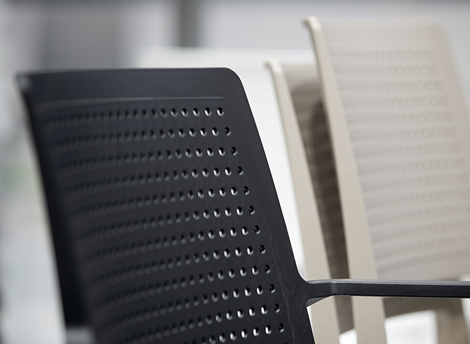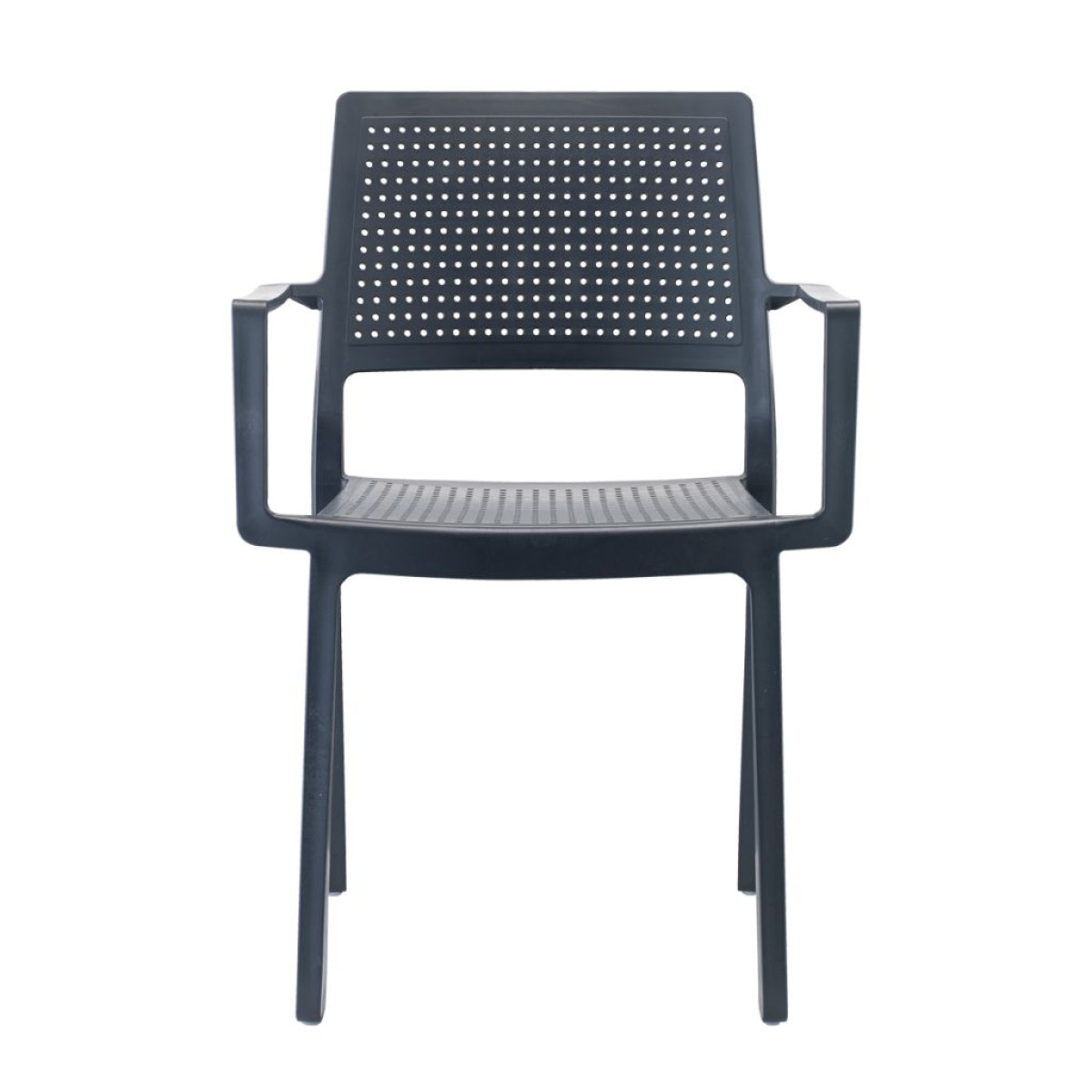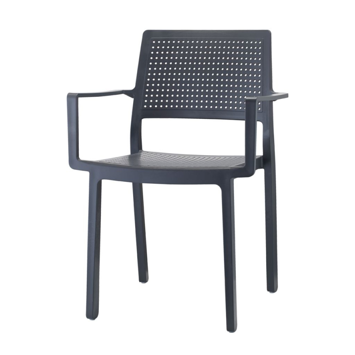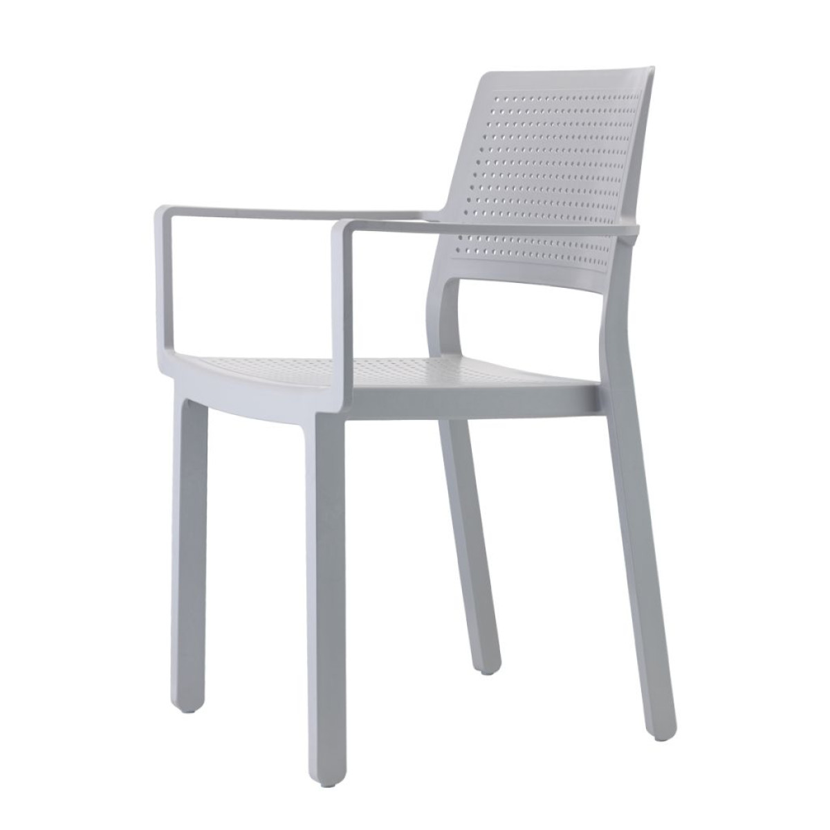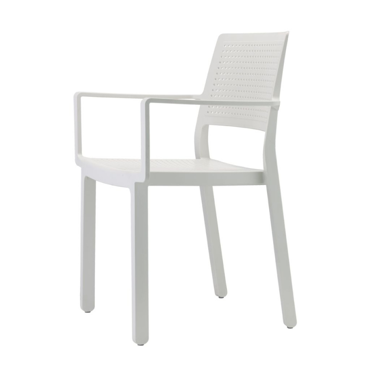 The EMI chair with armrests is made of a polypropylene monocoque, with micro-perforated seat and backrest, offering high resistance to wear and atmospheric agents.