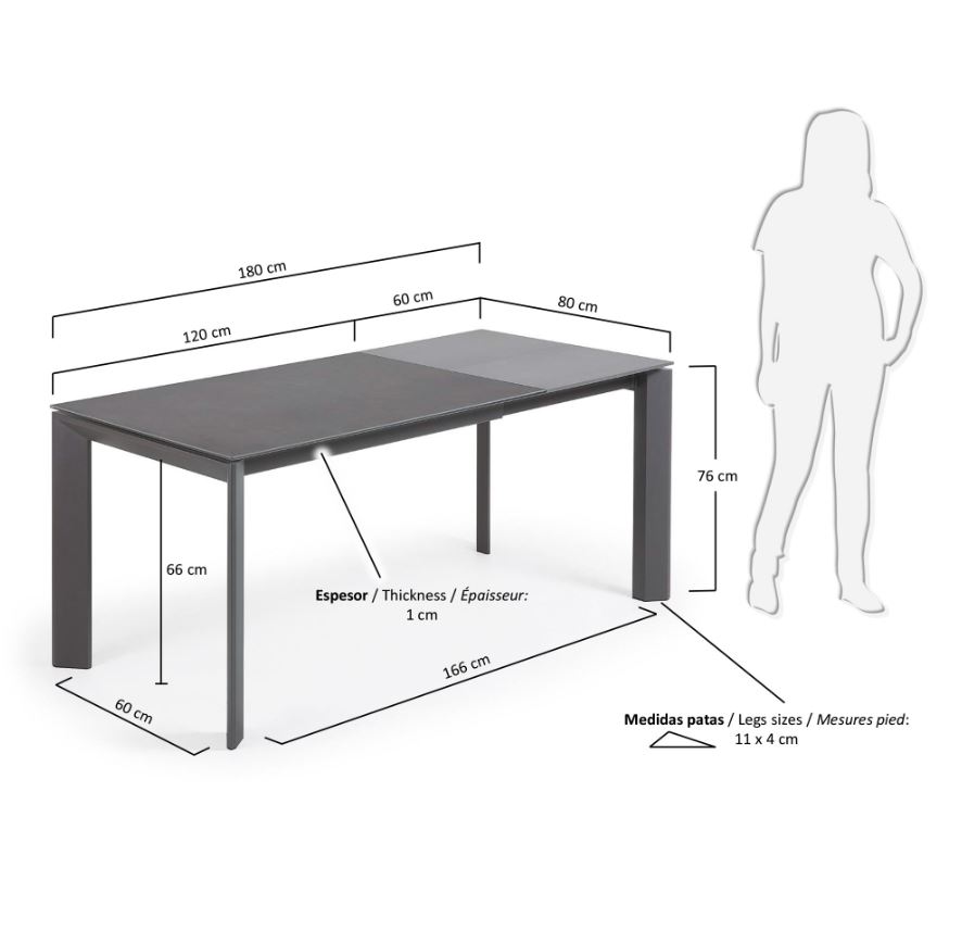 Extendable table with epoxy-coated steel frame and porcelain top with glass support. Roca Volcano finish. Maximum length 180 cm.
