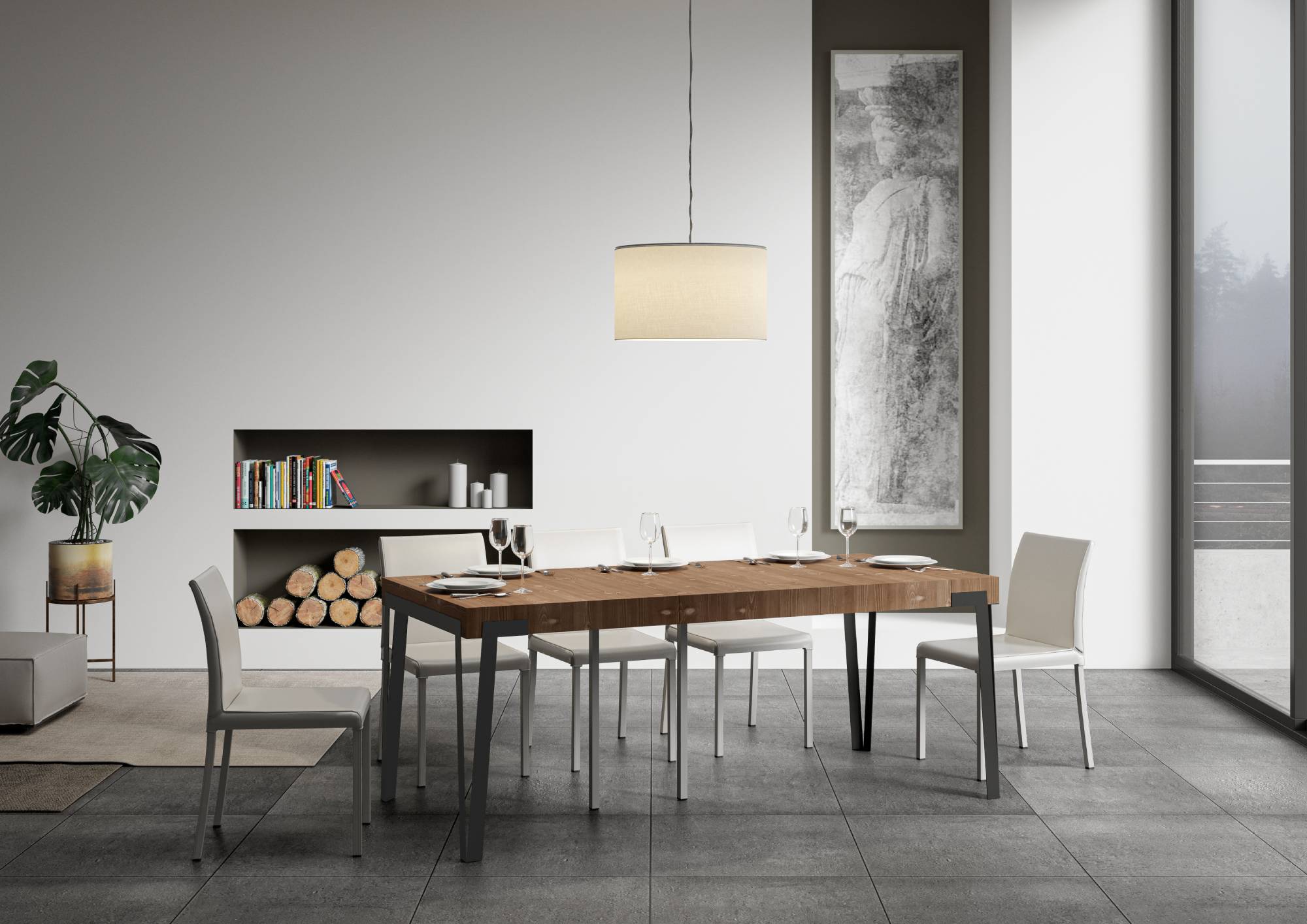 The Rio Premium Small extendable console table is versatile and sturdy, making it a perfect addition to any room in the home: entryway, kitchen, dining room, living room, or hallway. The Rio Premium Small extendable console table can easily be transformed into a large dining table up to 196 cm long, seating 10 people. Made from melamine-faced panels and iron legs, the extension system with telescopic aluminum runners and the included central support make the console table stable and sturdy. Once the console table is closed, the extensions must be stored away. Itamoby product, Made in Italy. Dimensions: Closed console table: W 90 D 40 H 77 cm. Length with 1 extension: 92 cm. Length with 2 extensions: 144 cm. Length with 3 extensions: 196 cm.