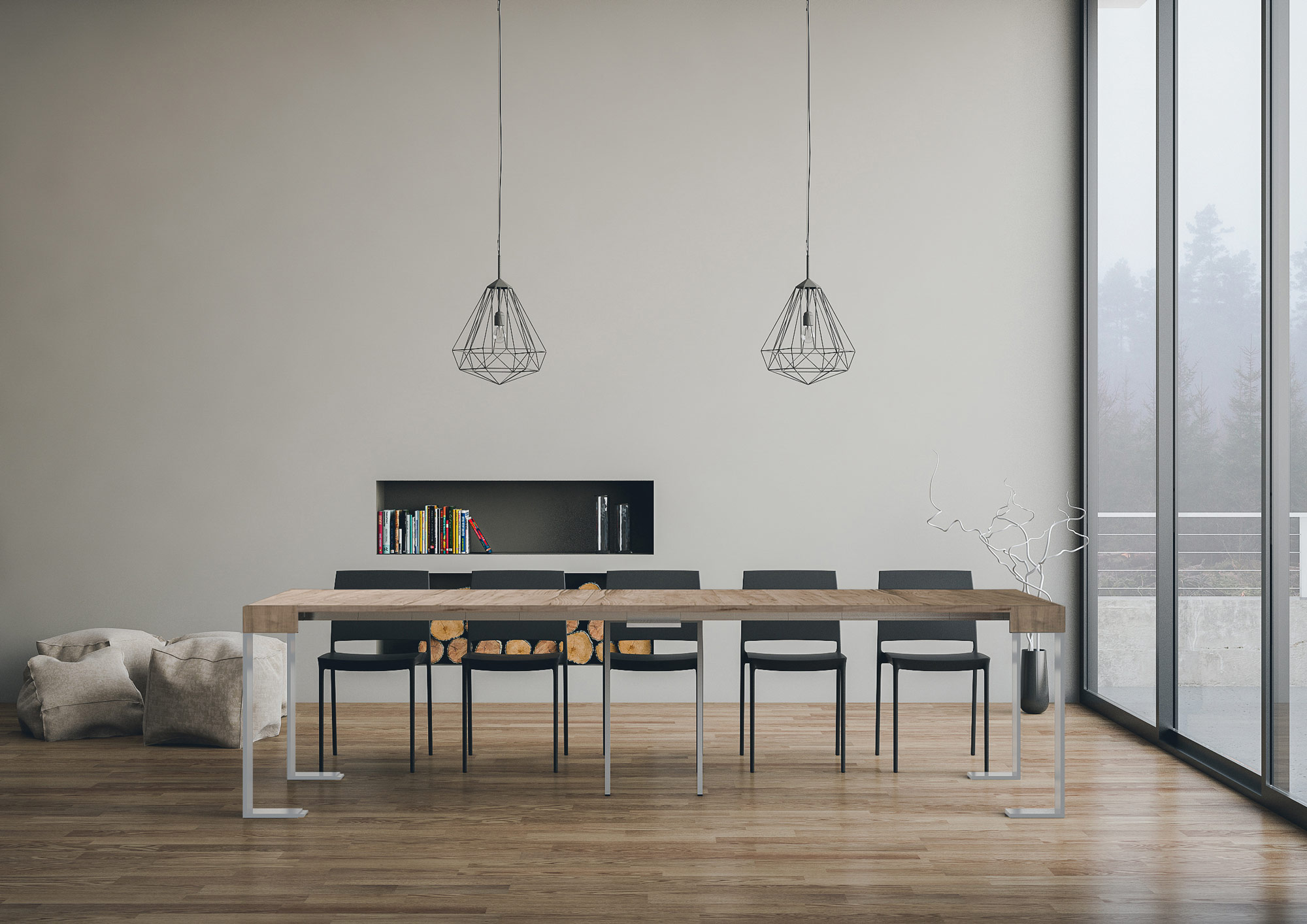 Extending console table Tecno, versatile and robust, a perfect furnishing solution ideal for any environment: entrance, kitchen, dining room, living room or hallway. The extending console table Tecno can be turned effortlessly into a large dining table that can be extended up to 300 cm that can accommodate up to 14 people. Made of melamine boards and iron legs. The extending mechanism with telescopic aluminium rails and the provided central support system make the console table steady and sturdy. When the console table is collapsed, the extension leaves have to be stored elsewhere. Itamoby product Made in Italy Sizes: Closed console table: L.90 D.40 H.77 cm Length with 1 leaf: 92 cm Length with 2 leaves: 144 cm Length with 3 leaves:: 196 cm Length with 4 leaves: 248 cm Length with 5 leaves: 300 cm