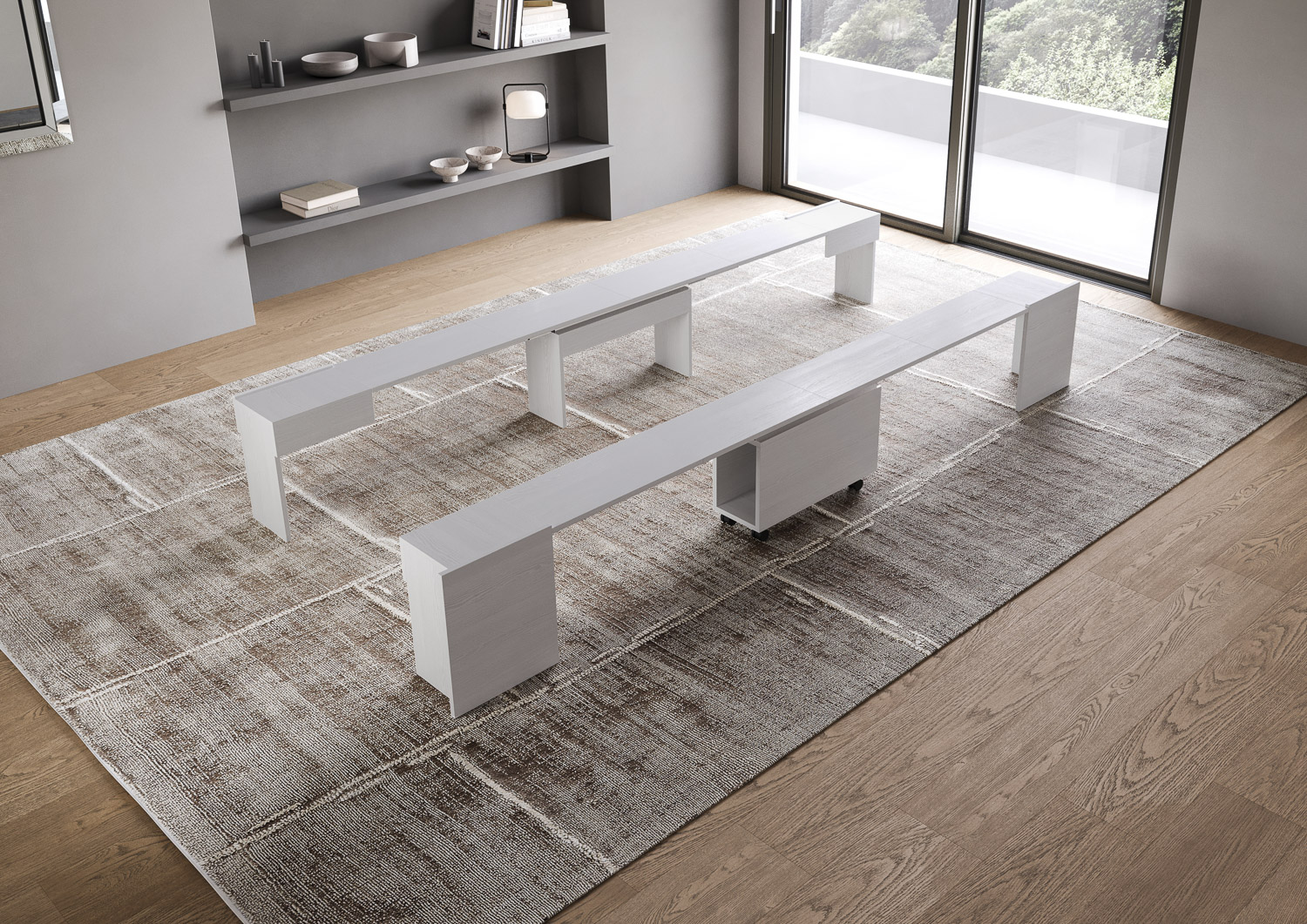 Each bench is provided with 4 extension leaves, 57 cm each, and can accommodate up to 6 people, for a total of 12 people with two benches. When not used, the 8 leaves can be stored inside a practical storage compartment inside the structure of the lower bench. The lower bench is equipped with practical rotating wheels so that it can be easily moved around.