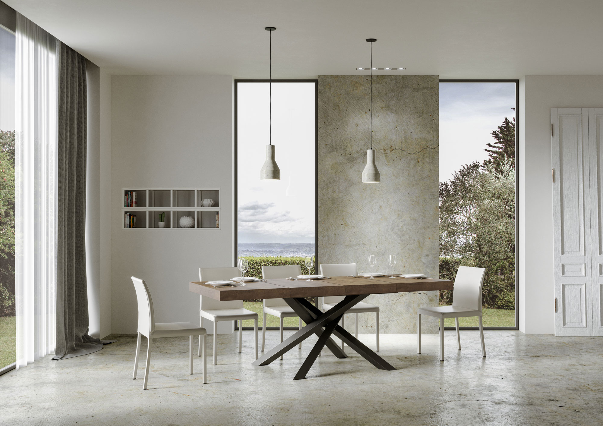 Extendable table Volantis Premium 140 modern and sophisticated in design, fits perfectly in any furnishing style and it proves to be the perfect choice both as a dining table and as a design furnishing piece for the living room, where you can welcome your guests in style. The extendable table Volantis Premium can extend progressively up to 244 cm, and is able to accommodate up to 12 people. Made of melamine boards, iron legs, tabletop and extension leaves are worked in miter folding technique. The extending mechanism with aluminium telescopic rails makes the table steady and sturdy even when fully extended, without the need of external supports. When not used, the extension leaves have to be stored elsewhere. Itamoby product Made in Italy Sizes: Closed table: L.140 D.90 H.77 cm Length with 1 extension leaf: 192 cm Length with 2 extension leaves: 244 cm