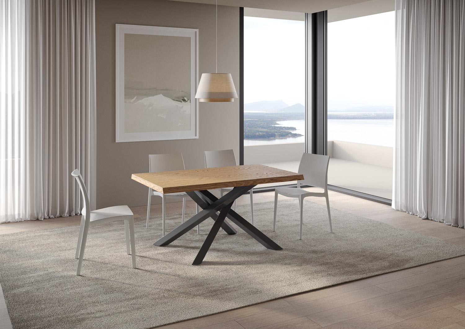 The 160 cm Versalux extendable table, with its sophisticated modern design, adapts to any decor style and is the ideal choice both as a dining table and as a living room piece, where you can welcome guests in style. The Versalux extendable table extends up to 210 cm, seating 10 people. Made with an oak veneer top, solid wood on all four sides and debarked on the long sides, it features a honeycomb core extension and painted iron legs. The extension is in anthracite to prevent color variations with the wooden top, which can change color over time due to exposure to light. Using an extension in the same color could create visual differences, while anthracite ensures a uniform and long-lasting appearance. The extension does not fit inside the table and should be stored elsewhere. Thickness of top and extension: 5 cm Product Itamoby Made in Italy Dimensions: Closed table: L.160 D.90 H.75 cm Length with 1 extension: 210 cm