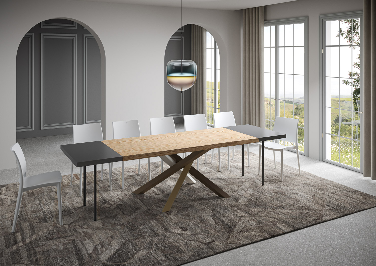 The 200 cm Versalux extendable table, with its sophisticated modern design, adapts to any decor style and is the ideal choice both as a dining table and as a living room piece, where you can welcome guests in style. The Versalux extendable table extends up to 300 cm, seating 12 people. Made with an oak veneer top, solid wood on all four sides and debarked on the long sides, honeycomb wood extension leaves, and painted iron legs. The anthracite extension leaves prevent color variations with the wooden top, which can change color over time due to exposure to light. Using extension leaves of the same color could create visual differences, while anthracite ensures a uniform and long-lasting appearance. The extension leaves do not fit inside the table and should be stored elsewhere. Thickness of top and extensions: 5 cm Itamoby product Made in Italy Dimensions: Closed table: L.200 D.90 H.75 cm Length with 1 extension: 250 cm Length with 2 extensions: 300 cm