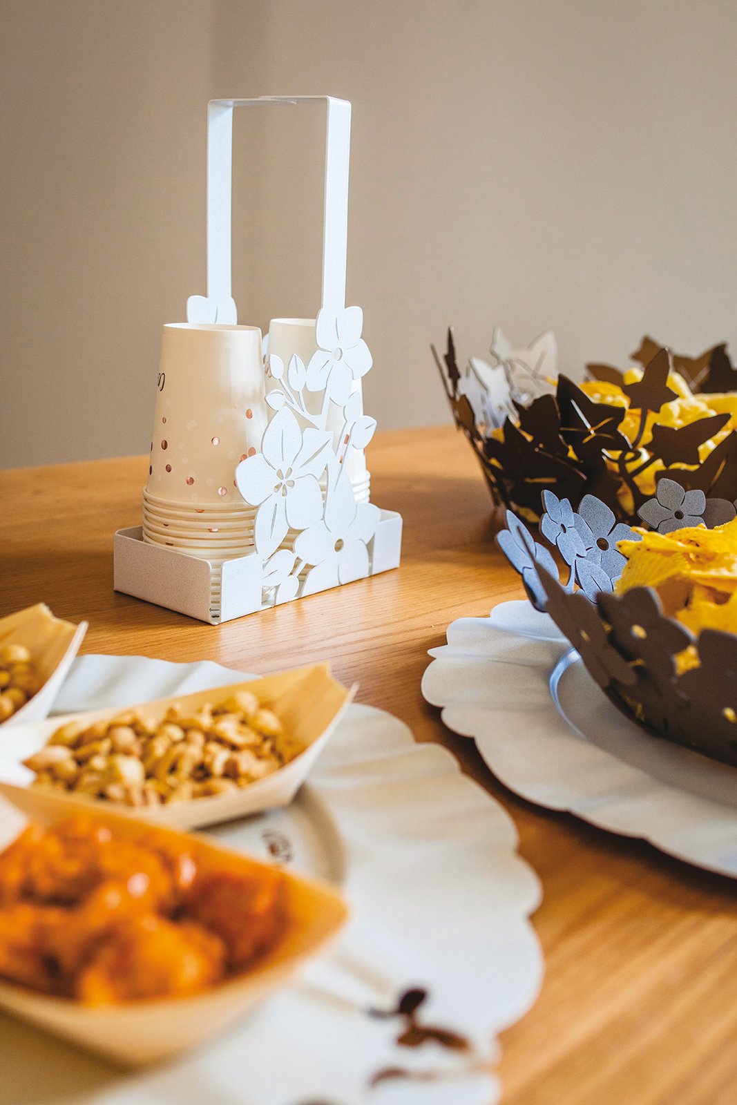 The parties are held all year round. Whether it's a simple meeting or a birthday, however, the glasses have to be arranged somewhere. A nice floral design cup holder could be the place!