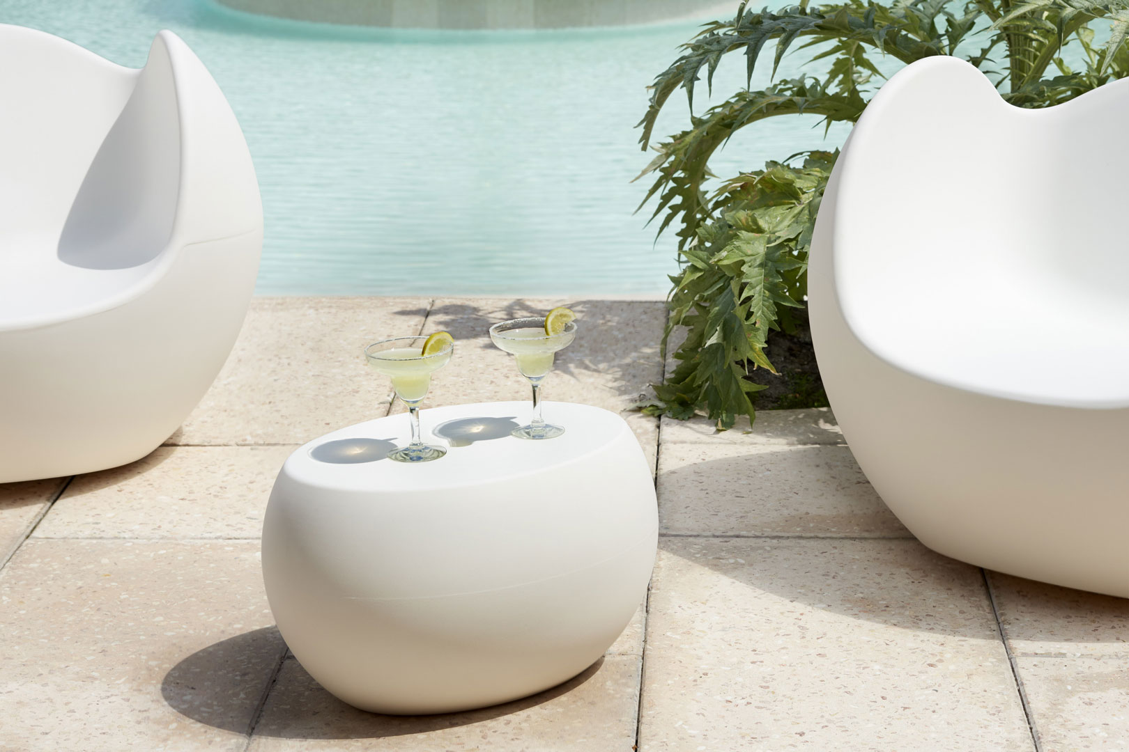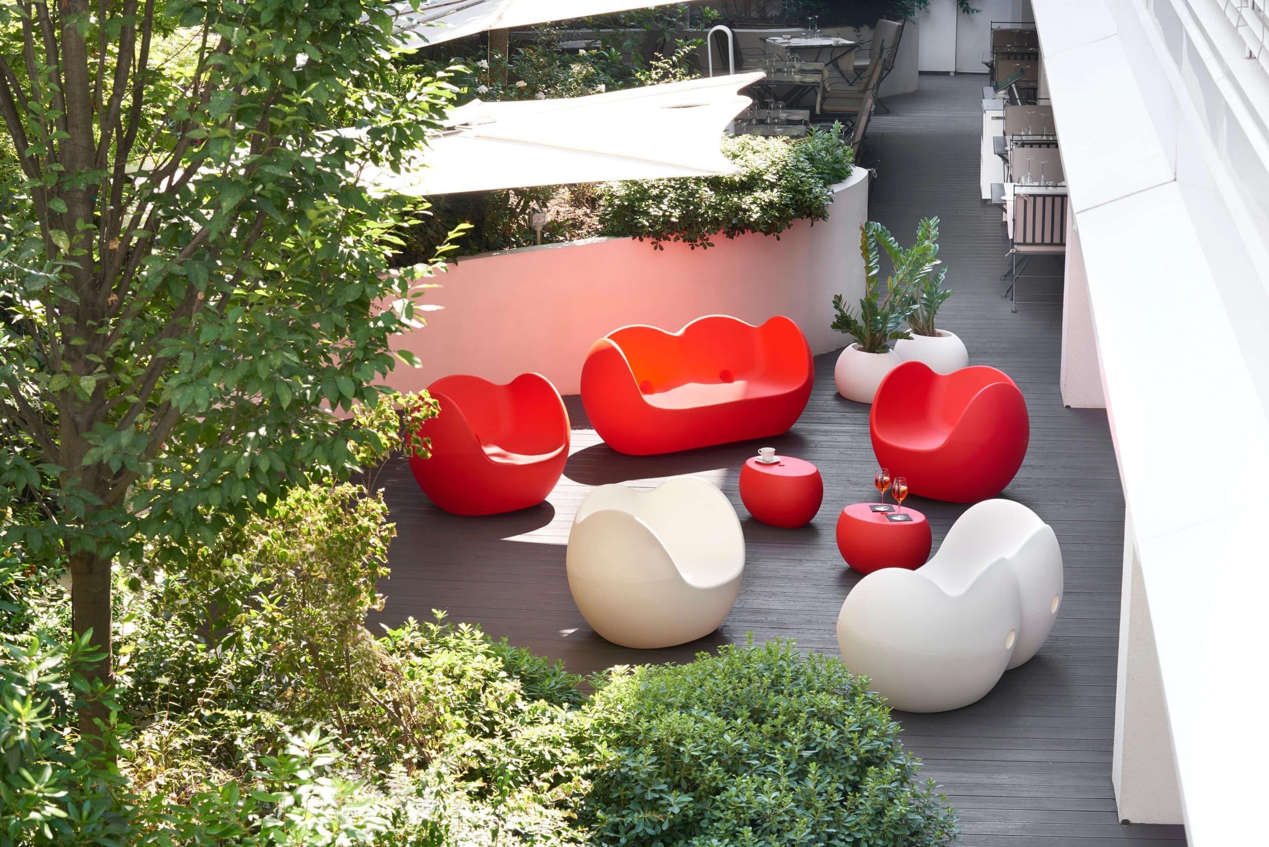 The fun shape of the top of Fizzz recalls the cap of a bottle, supported by an elegant conical plastic base. Fizzz, ideal for indoor and outdoor contract and event spaces, adapts to spaces thanks to the base of different sizes and the many colors in which it is available.