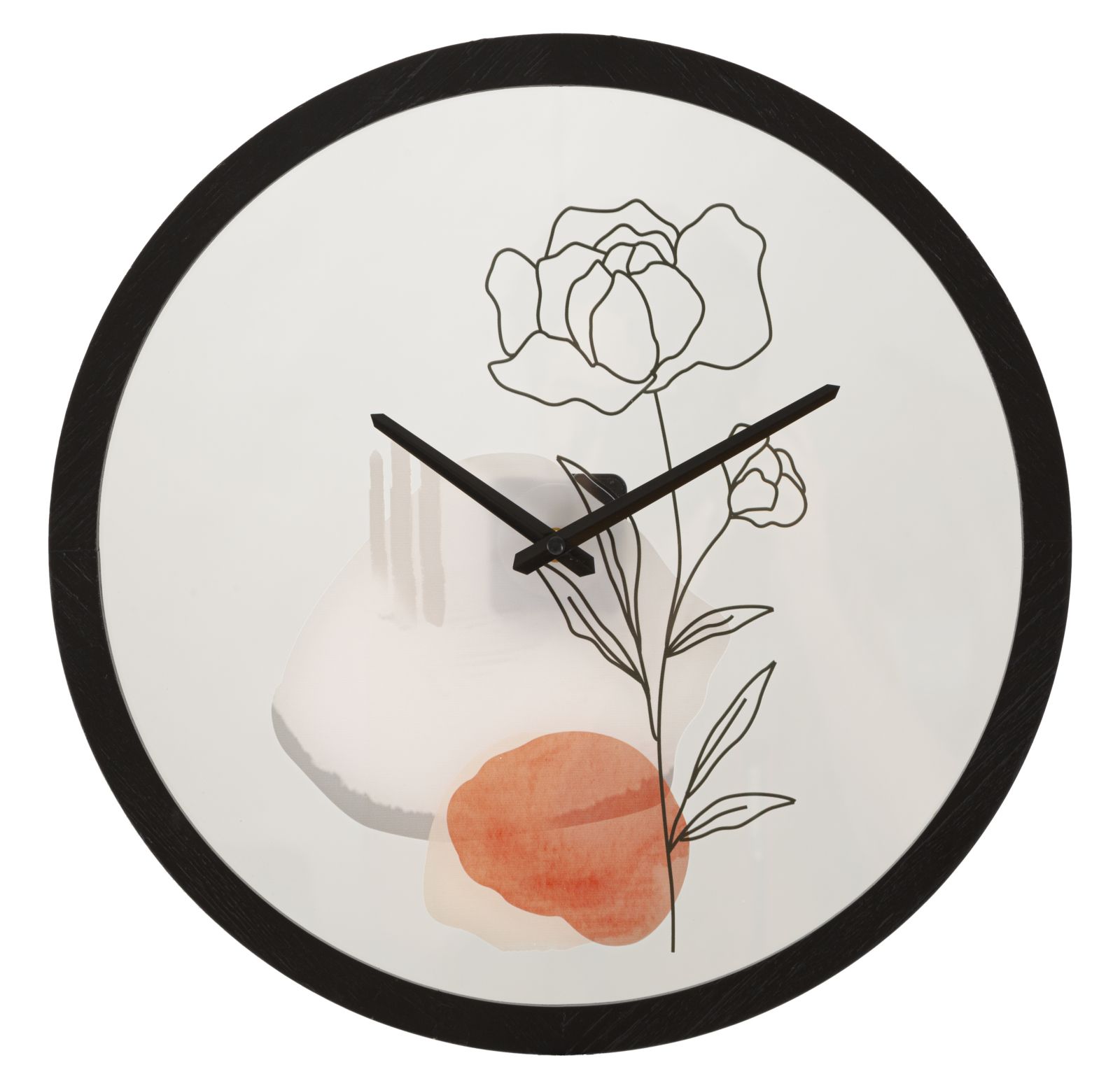 Round wall clock with simple and essential lines embellished with a rose design inside the dial.
