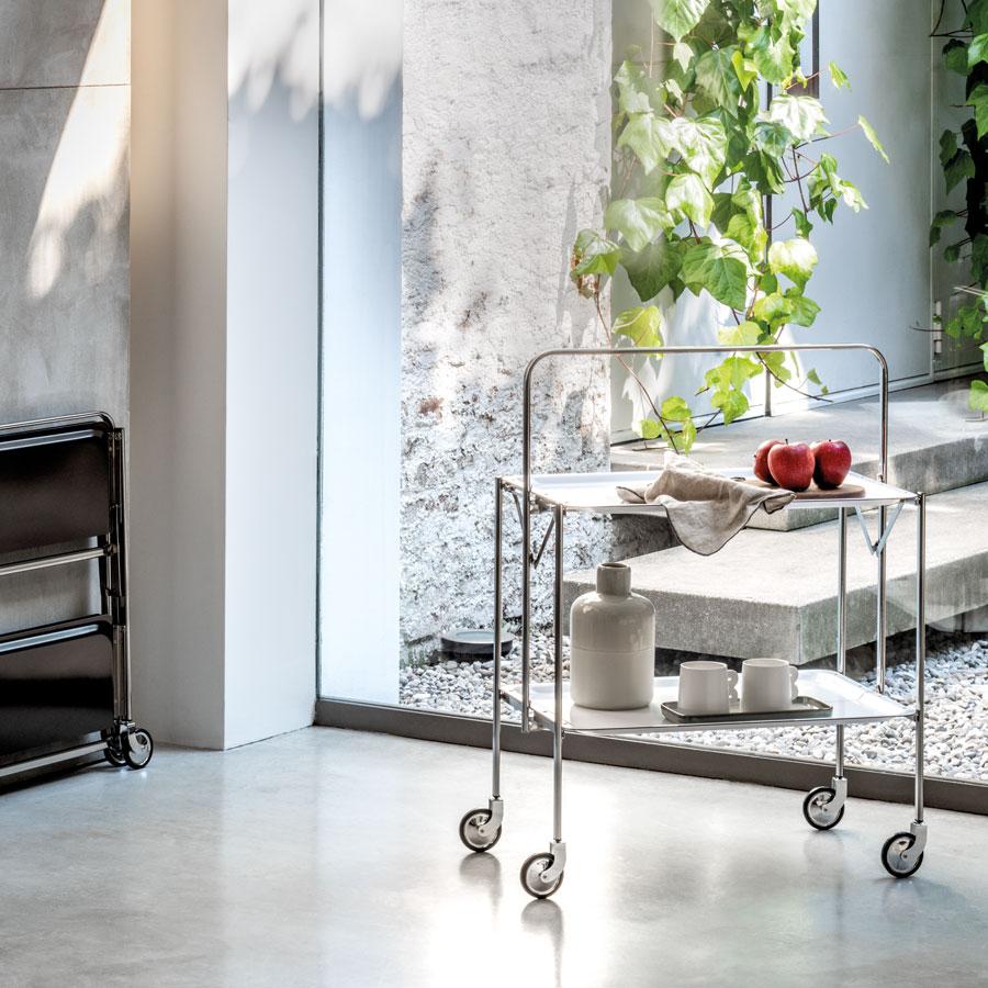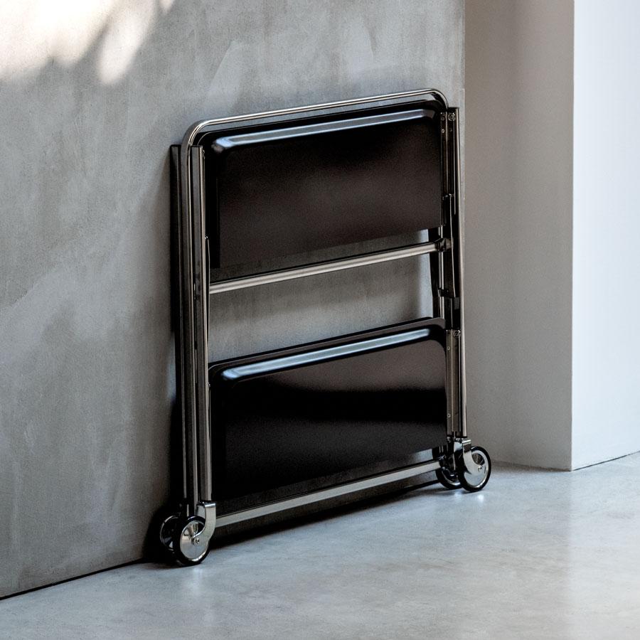 Foldable trolley made with a solid chromed or painted steel structure in a sablè finish and shelves in resistant Formica, guaranteeing maximum structural solidity.