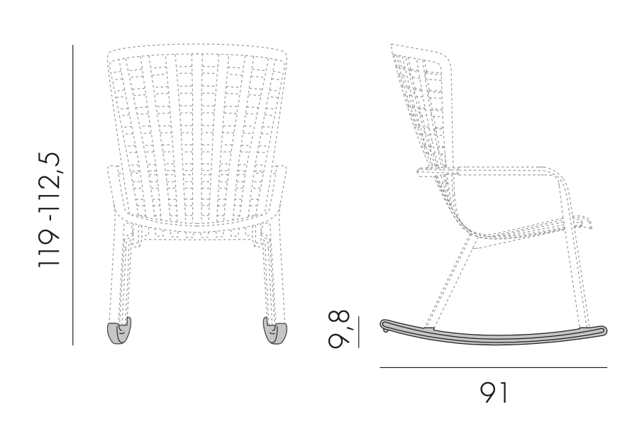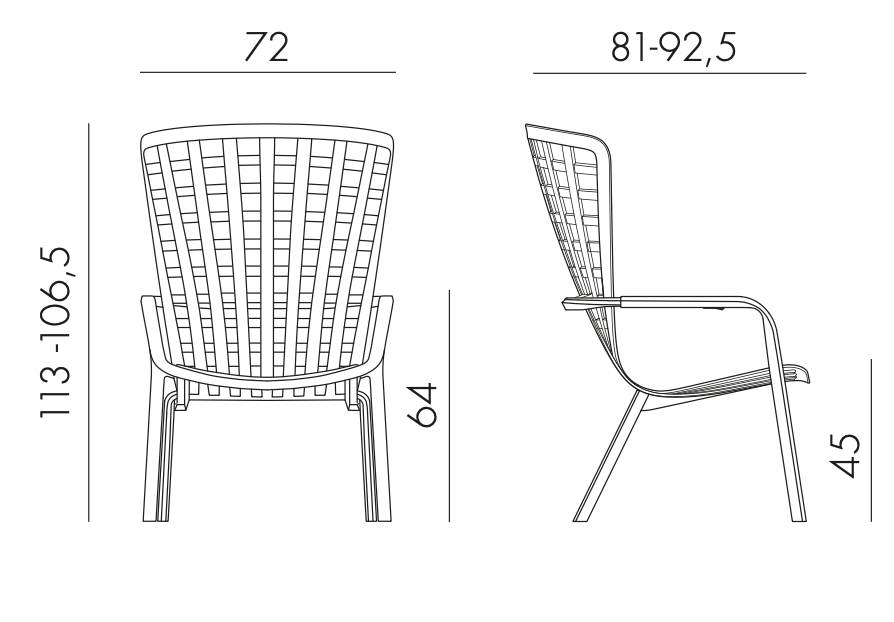 Reclining armchair. Material: fiberglass polypropylene treated with anti-UV and colored in mass. Matte finish. Equipped with non-slip feet. Cushion available to order. Recyclable resin.