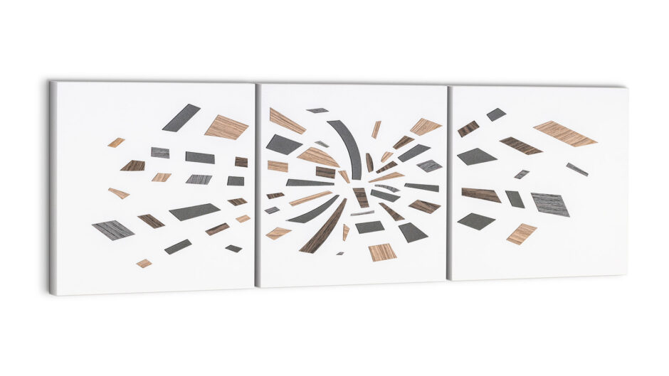 The support is in 330g cotton blend canvas applied to a wooden frame. The applications are made of tone-on-tone laminate and wood with different essences.