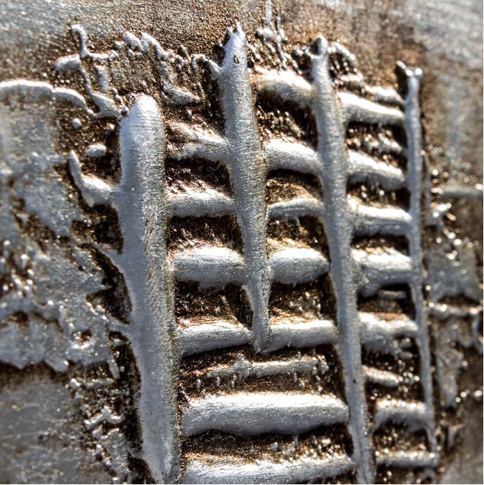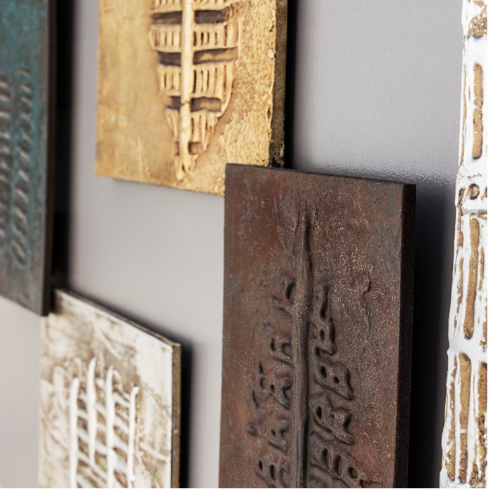 Eight overlapping material elements decorated by hand with gold, silver, etched bronze finishes, rust effect, dove gray lacquered canvas structure, glossy finish.