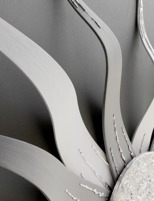 Framework on gray lacquered canvas with curved and overlapping structures, central element in hand-decorated silver leaf on material processing.
