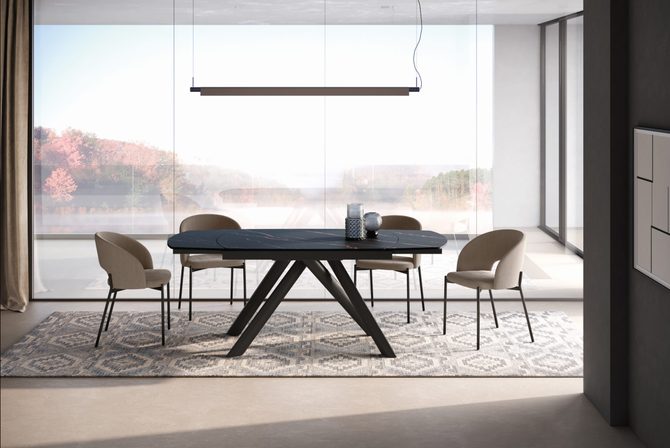 Elegant and contemporary chair with a matt black lacquered steel frame, with a slender yet solid design.
