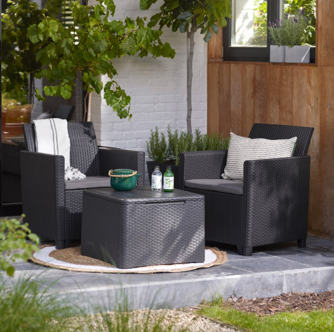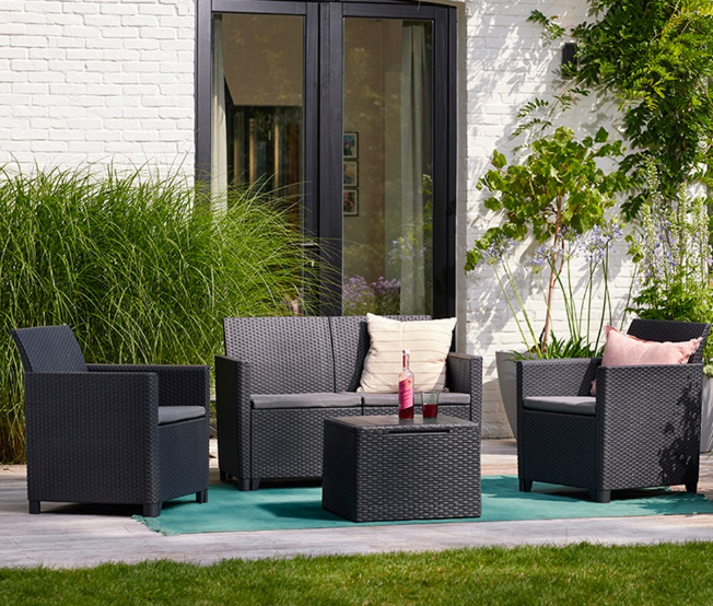 The Claire set by Keter is an elegant and functional garden lounge set, made of woven rattan-effect resin and polypropylene, resistant to weather and UV rays.