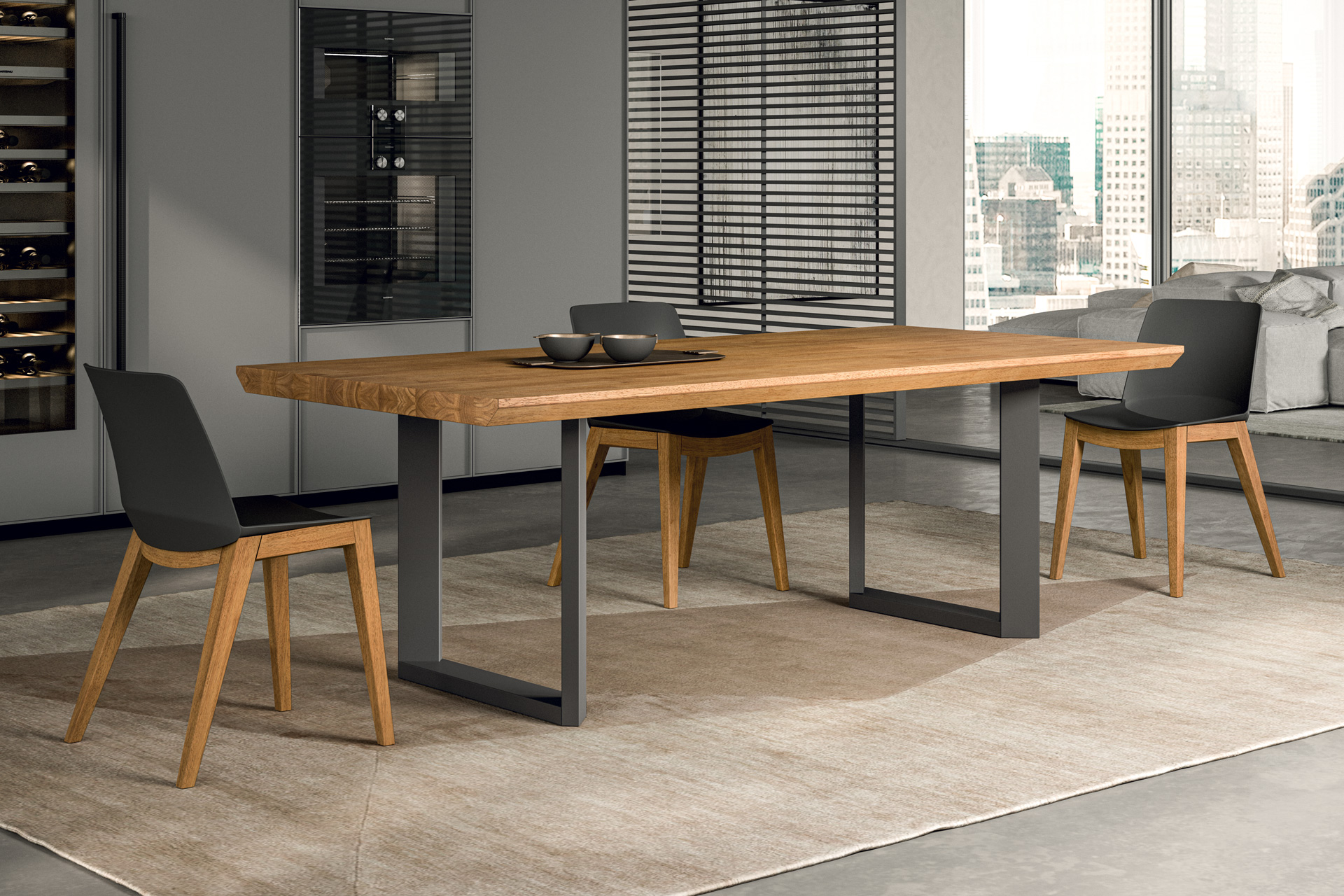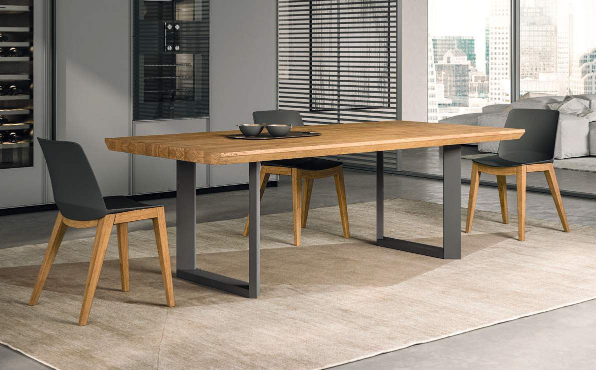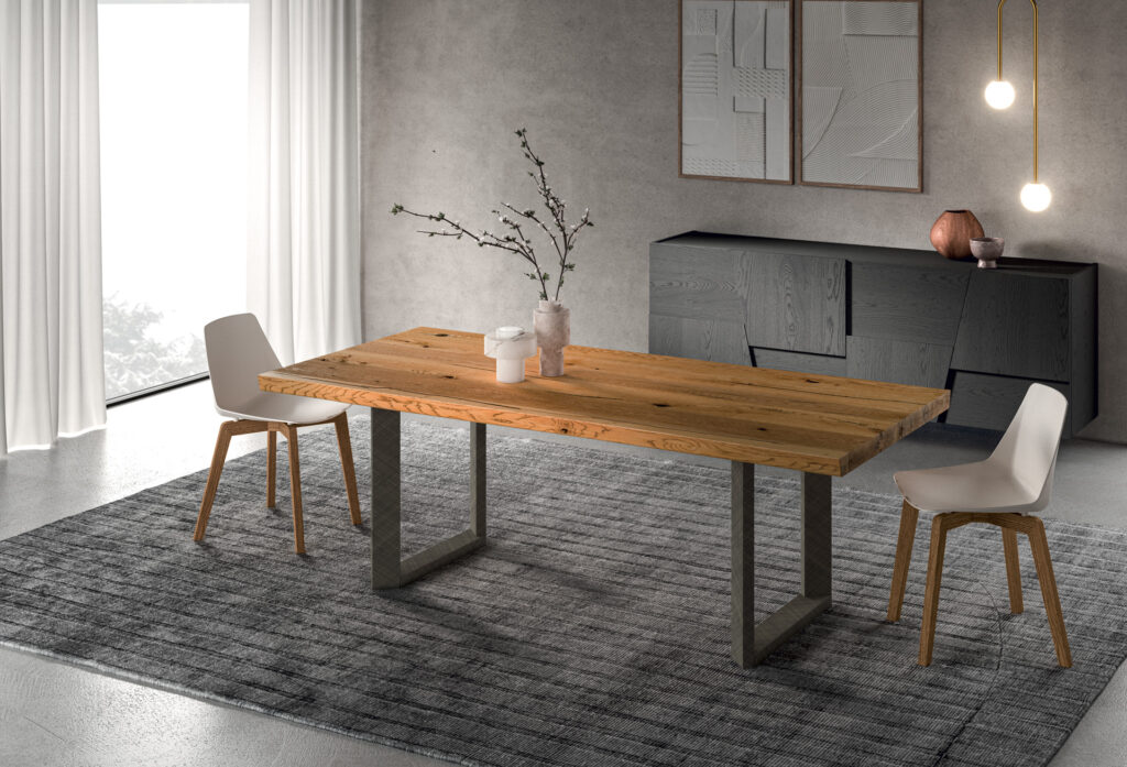 The edge of the table, made of real wood, can be squared or with a barked edge, lively and full of personality, recalling the authenticity and naturalness of the trunk from which it is obtained.