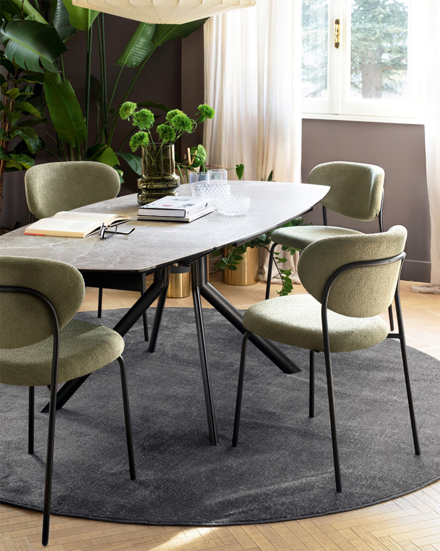 This modern dining table stands out for its refined style, with slanted legs and a stone-effect ceramic top , durable and aesthetically pleasing. Its contemporary design fits perfectly into any room in the home—from the living room to the kitchen, to the dining room—adding a touch of class and practicality.