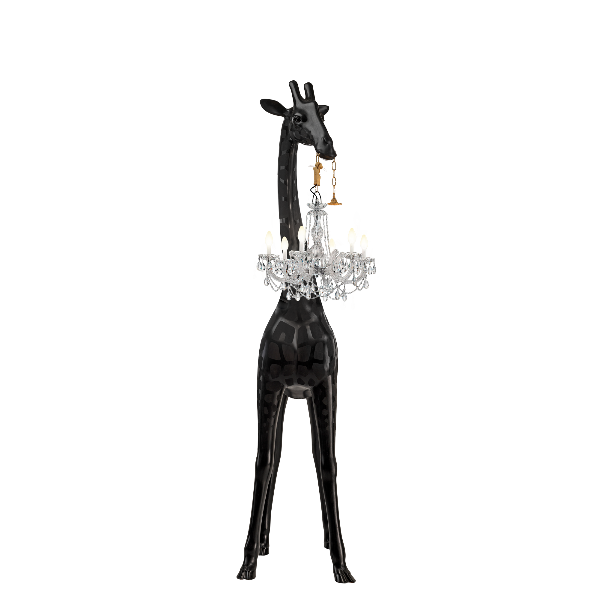 Designed by Marcantonio, Giraffe in Love M is a 2.65-metre-high giraffe holding up a classic Marie-Thérèse-style chandelier, totally waterproof and IP65 certified. Bold and elegant, it will naturally be the center of attention of any space it is placed in, both indoors and outdoors.