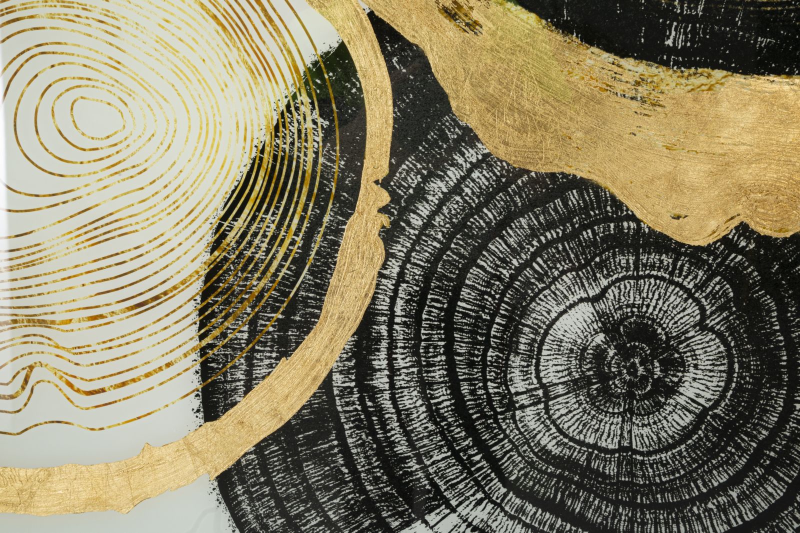 Decorative glass panel with elegant abstract decorations. The panel is enclosed in a simple gilt metal frame.