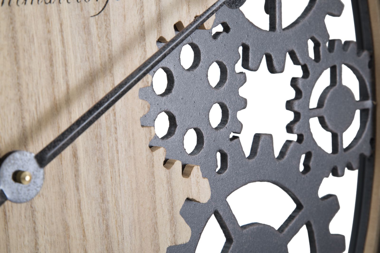 Round wall clock with gears that recall the internal mechanisms of mechanical devices.