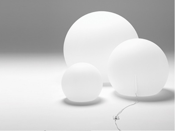 Low energy consumption floor lamp with lighting body made of polyethylene through rotational molding technology. The practical handle positioned on the base makes it easy to take and move. White cap-handle combined with transparent cable.
