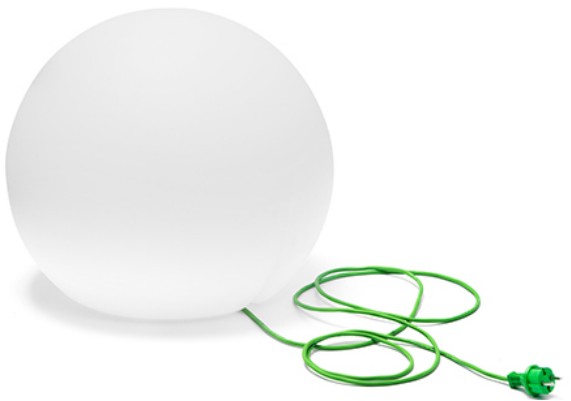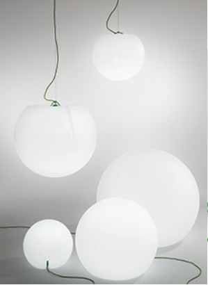 A sphere that is not a sphere: resting, it seems that it is emerging from the ground, hanging from the branch of a tree, it recalls a ripe fruit. Floor lamp and suspension lamp suitable for outdoor use. The practical handle positioned on the base makes it easy to take, move and hang.